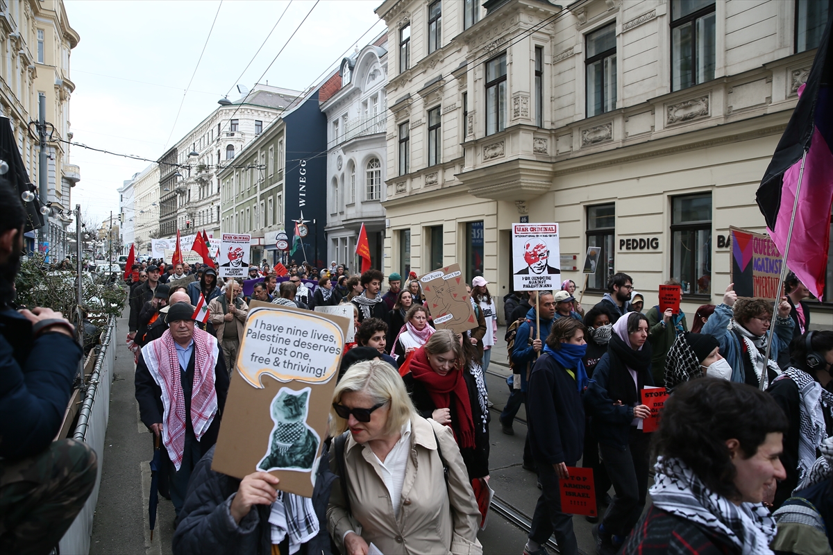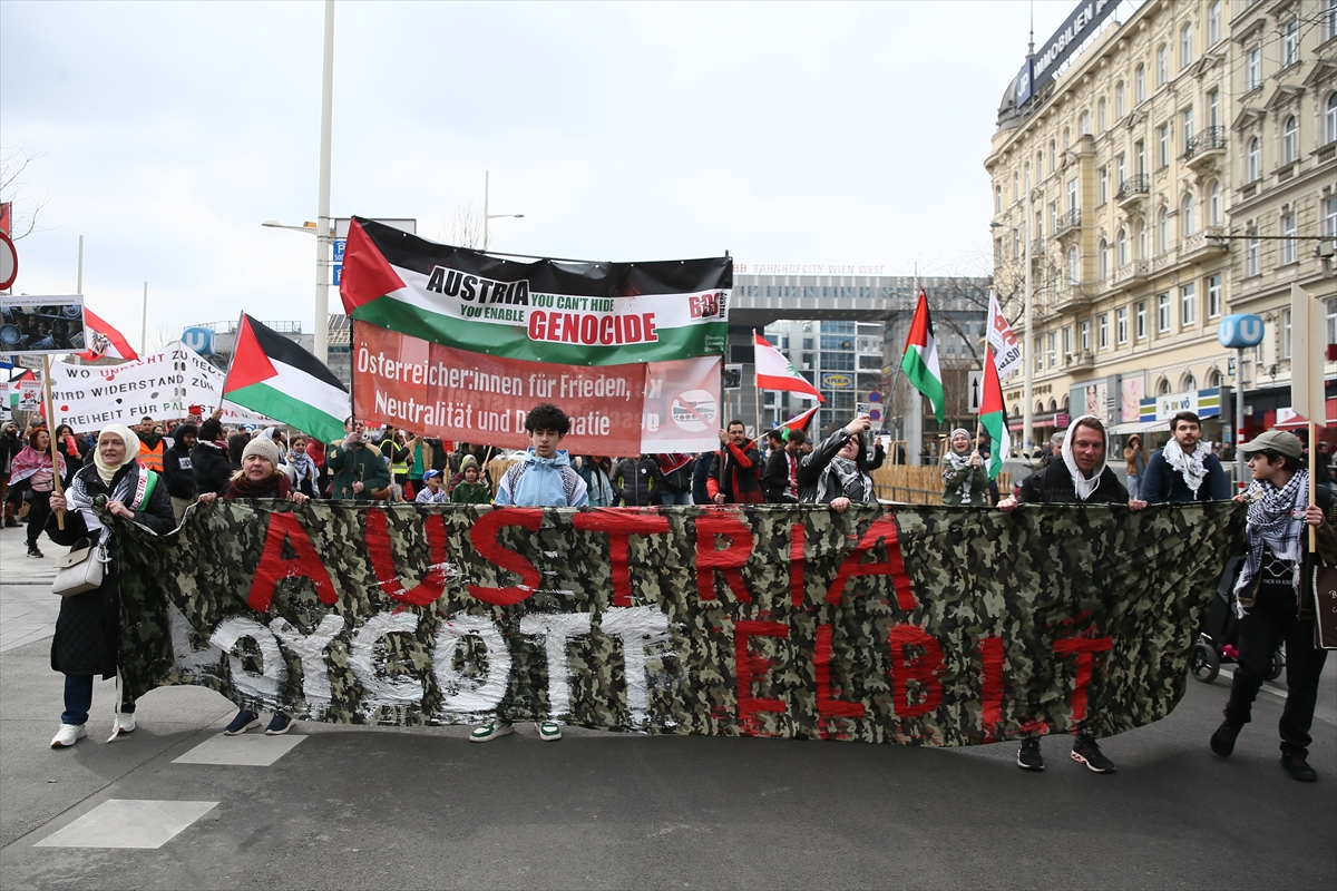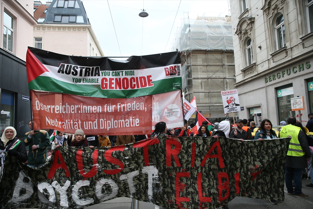Viyana'nın önemli noktalarından Mariahilfer Caddesi'nde toplanan göstericiler, Filistin bayraklarının yanı sıra "Çocukların öldürülmesine hayır", "Şimdi Ateşkes", "Boykot İsrail" yazılı pankartlar taşıdı.