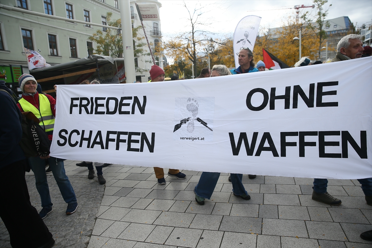 "Barış, tarafsızlık ve egemen bir Avusturya için" çağrısıyla birçok sivil toplum kuruluşunun ortak düzenlediği gösteride, çatışmaların olduğu ülkelere silah sevkiyatına devam ettiği ve Gazze'de soykırım işleyen İsrail'e destek verdiği gerekçesiyle Avusturya hükümeti protesto edildi.
