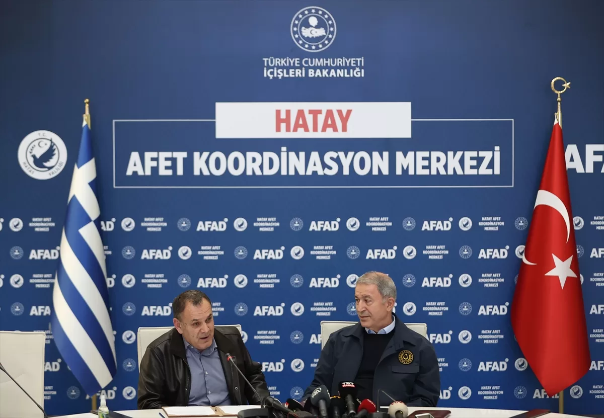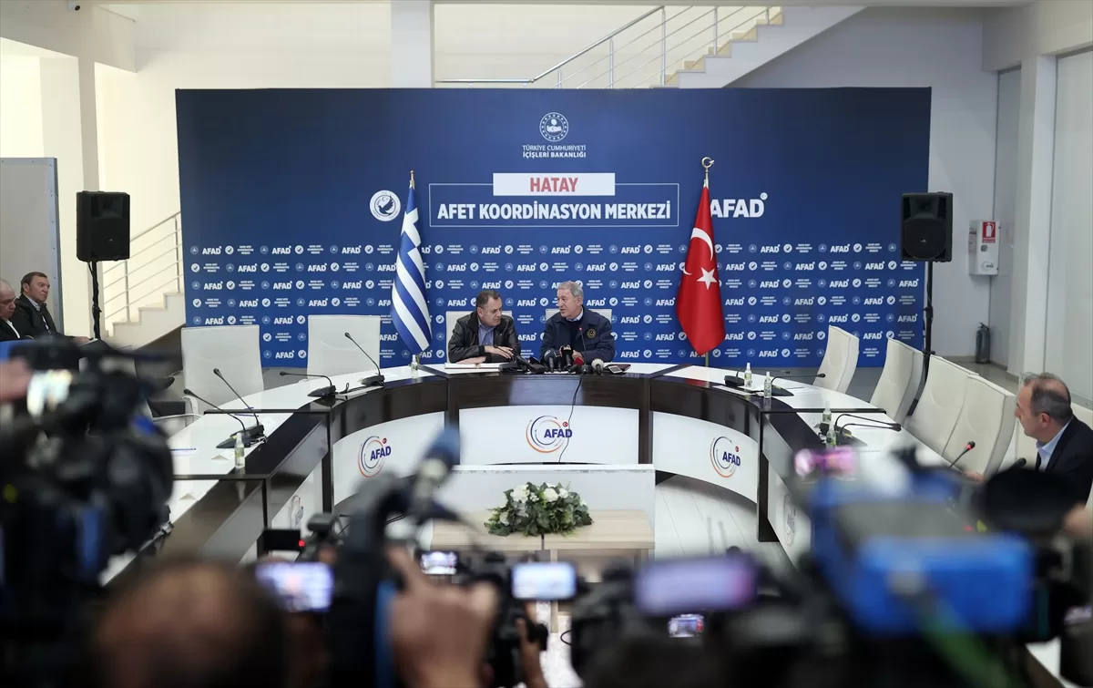 Akar, 6 Şubat'taki Kahramanmaraş merkezli depremlerin etkilediği Hatay'a davetlisi olarak gelen Yunanistan Savunma Bakanı Nikolaos Panagiotopoulos ile Afet Koordinasyon Merkezi'nde ortak basın toplantısı düzenledi.