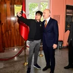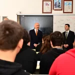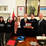 Karaismailoğlu'na, okul yönetimi tarafından diplomasının örneği takdim edildi, okul rozeti takıldı.