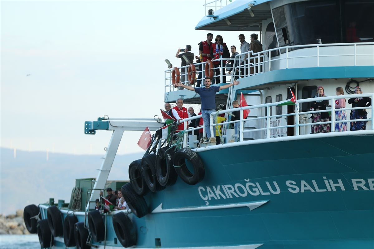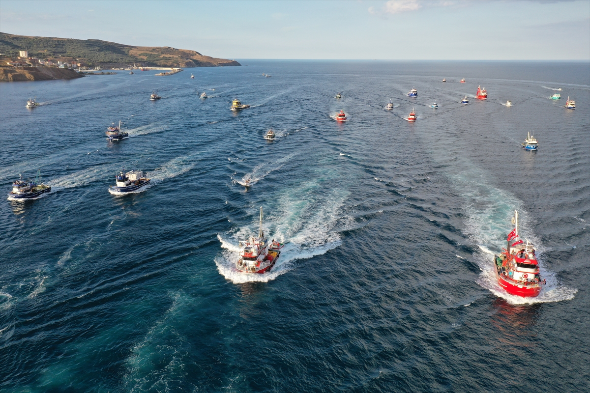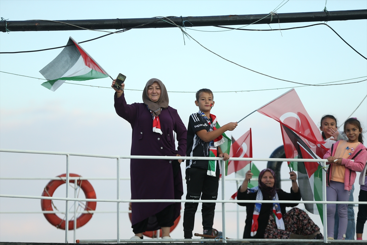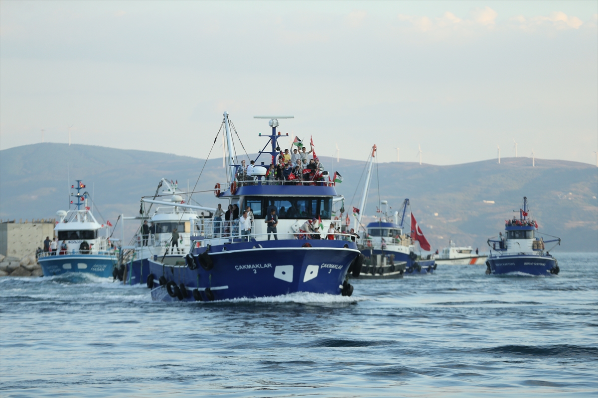 Daha sonra Filistin ve Küresel Sumud Filosu'na destek olmak ve İsrail'in saldırılarını protesto etmek amacıyla bir araya gelen denizciler, gemi ve teknelerle Marmara'ya açıldı.