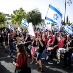 Binlerce İsrailli, Batı Kudüs'teki tren istasyonunda İsrail bayrakları, davul ve düdüklerle toplandı. Göstericiler daha sonra Batı Kudüs'teki İsrail Meclisi binasına yürüdü.