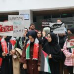 Bu kapsamda Kültür Merkezi fuaye alanında bir araya gelen öğrenciler, taşıdıkları Türk ve Filistin bayrakları ile "Özgür Filistin", "Sessiz kalma, soykırıma ortak olma", "Filistin'de katilin parmak izi İsrail", "Filistin'de zulme dur de", "Müslüman zulme boyun eğmez", "Filistin'de katliam var", "Filistin'in başkenti Kudüs'tür" ve "Çocuklardan ve adaletten tarafız" yazılı dövizlerle İsrail aleyhine sloganlar attı.