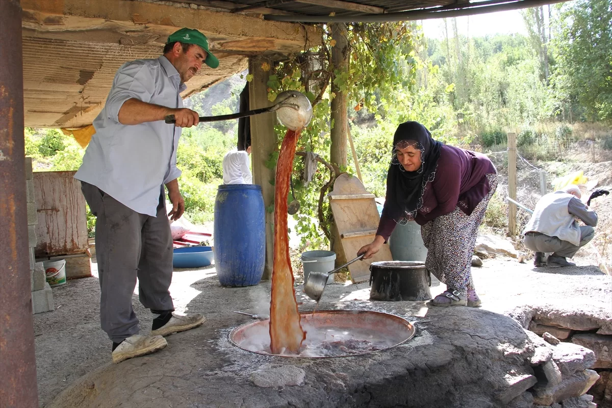 BİTLİS (AA) – Bitlis'in Hizan ilçesinde bağ bozumuyla dağların yamaçlarından toplanan üzümler, geleneksel yöntemlerle pekmeze dönüştürülüyor.