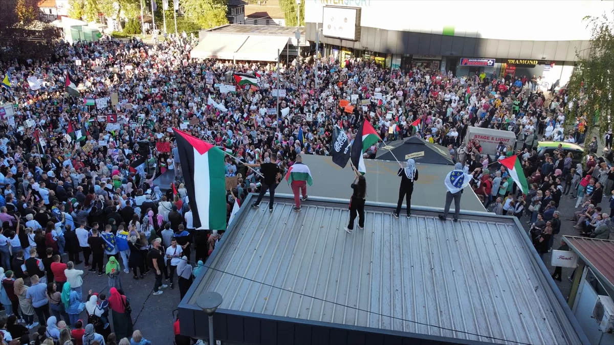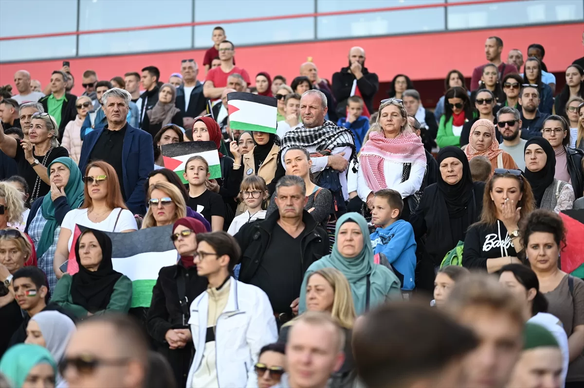 Yüzlerce Bosna Hersekli, ellerinde Filistin bayraklarıyla Zenica'daki Aliya İzetbegoviç Meydanı'nda toplandı.