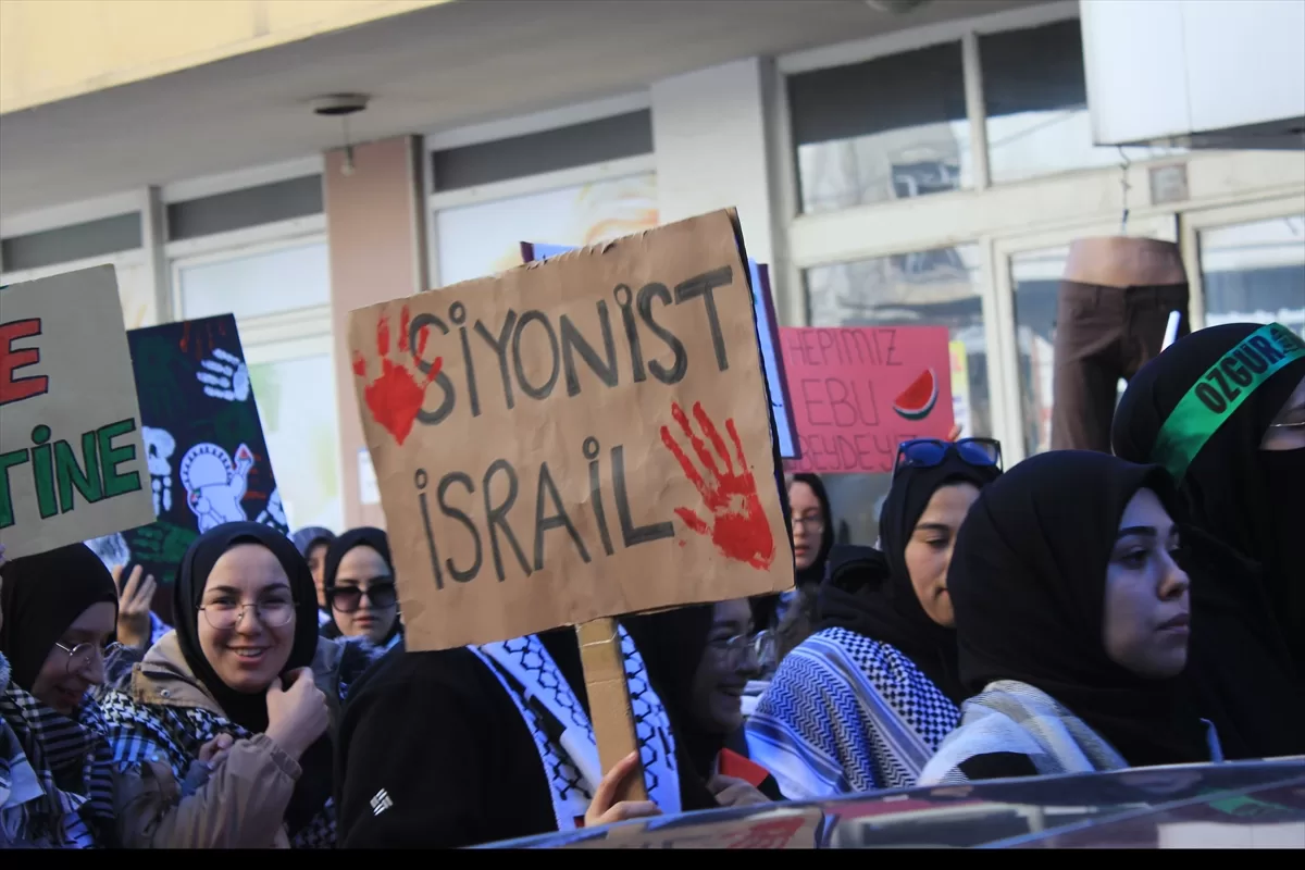 Ellerinde Filistin ve Türk bayraklarının yanı sıra pankart ve dövizler taşıyan katılımcılar, Haşim Benli Bulvarı ve Milli Egemenlik Caddesi'nden geçerek Cumhuriyet Meydanı'na ulaştı.