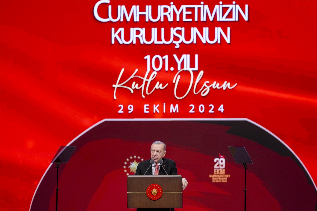 Konuşmasına Cumhuriyetin ilanının 101. yılını kutlayarak başlayan Erdoğan, Milli Mücadele'nin Başkomutanı, Cumhuriyetin banisi Gazi Mustafa Kemal Atatürk başta olmak üzere istiklalin ve istikbalin inşasında emeği, katkısı olan kahramanların her birini saygıyla andı. Erdoğan, "Bin yıldır bu toprakları vatanımız olarak tescillemek için canlarını feda etmekten çekinmeyen tüm şehit ve gazileri rahmetle anıyorum. Bugün de ister üniformalı, ister TUSAŞ'ta olduğu gibi üniformasız olsun milletimizin huzuru ve devletimizin bekası uğrunda hayatları pahasına mücadele eden kahramanlarımıza şükranlarımı sunuyorum." diye konuştu.