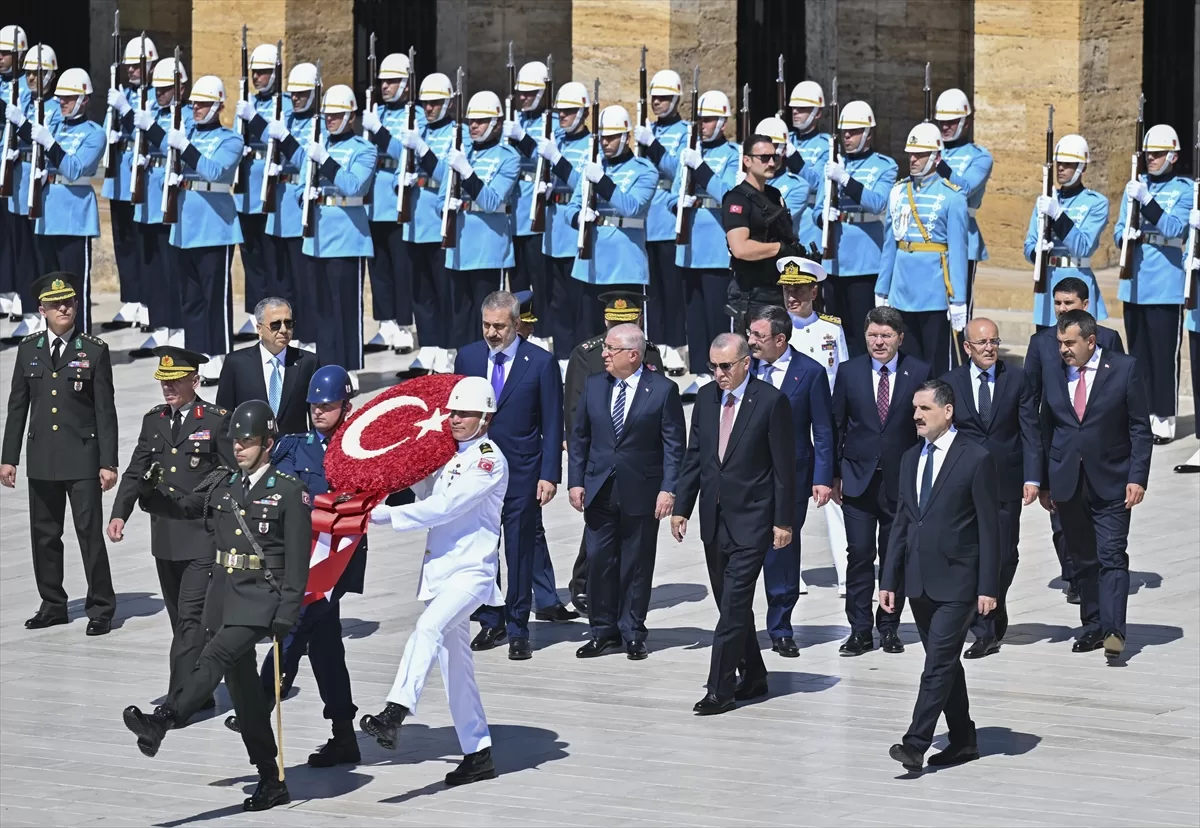 Erdoğan'ın Aslanlı Yol'un başındaki yerini almasının ardından başlayan törene, Cumhurbaşkanı Yardımcısı Cevdet Yılmaz, Adalet Bakanı Yılmaz Tunç, Dışişleri Bakanı Hakan Fidan, Hazine ve Maliye Bakanı Mehmet Şimşek, İçişleri Bakanı Ali Yerlikaya, Milli Eğitim Bakanı Yusuf Tekin, Milli Savunma Bakanı Yaşar Güler, Genelkurmay Başkanı olarak görevlendirilen Kara Kuvvetleri Komutanı Orgeneral Musa Avsever, Deniz Kuvvetleri Komutanı Oramiral Ercüment Tatlıoğlu ve Hava Kuvvetleri Komutanı Orgeneral Atilla Gülan katıldı.