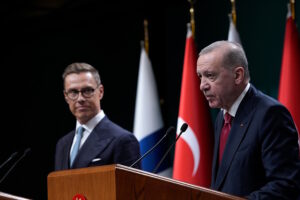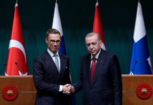 Finlandiyalı bir gazetecinin, Finlandiya’nın ve İsveç’in NATO’ya üyeliğinin Türkiye tarafından onaylanma süreciyle ilgili bir sorusu üzerine Erdoğan, “Finlandiya’yı biz öyle zannedildiği gibi bekletmedik.” karşılığını verdi.