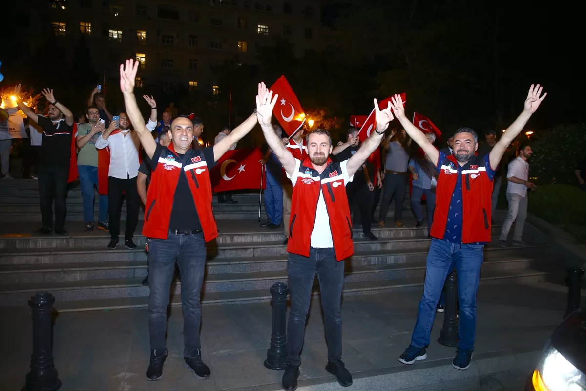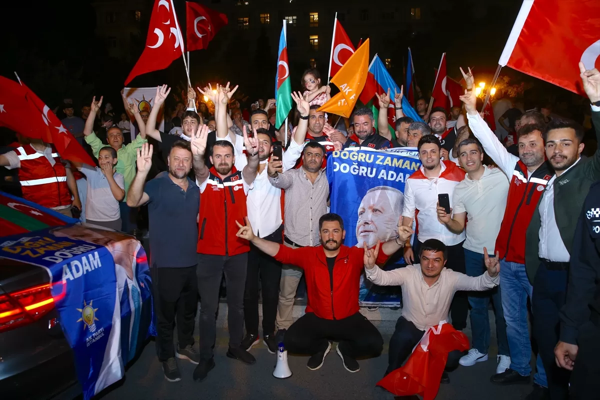Resmi olmayan seçim sonuçlarının belli olmasının ardından yüzlerce Azerbaycanlı ve bu ülkede yaşayan Türk vatandaşları, Türkiye'nin Bakü Büyükelçiliği yakınlarındaki parkta toplanarak seçim başarısı nedeniyle Erdoğan'ı kutladı.