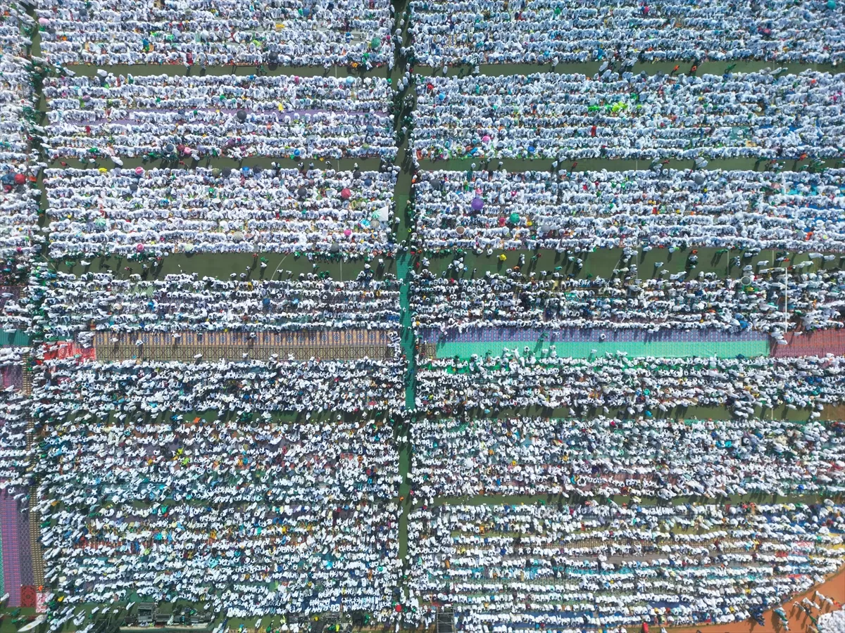Aralarında kadın ve çocukların da bulunduğu bembeyaz giyinen Ticani tarikatı takipçisi on binlerce kişi, stadyumu, saha içini ve dışını doldurdu.