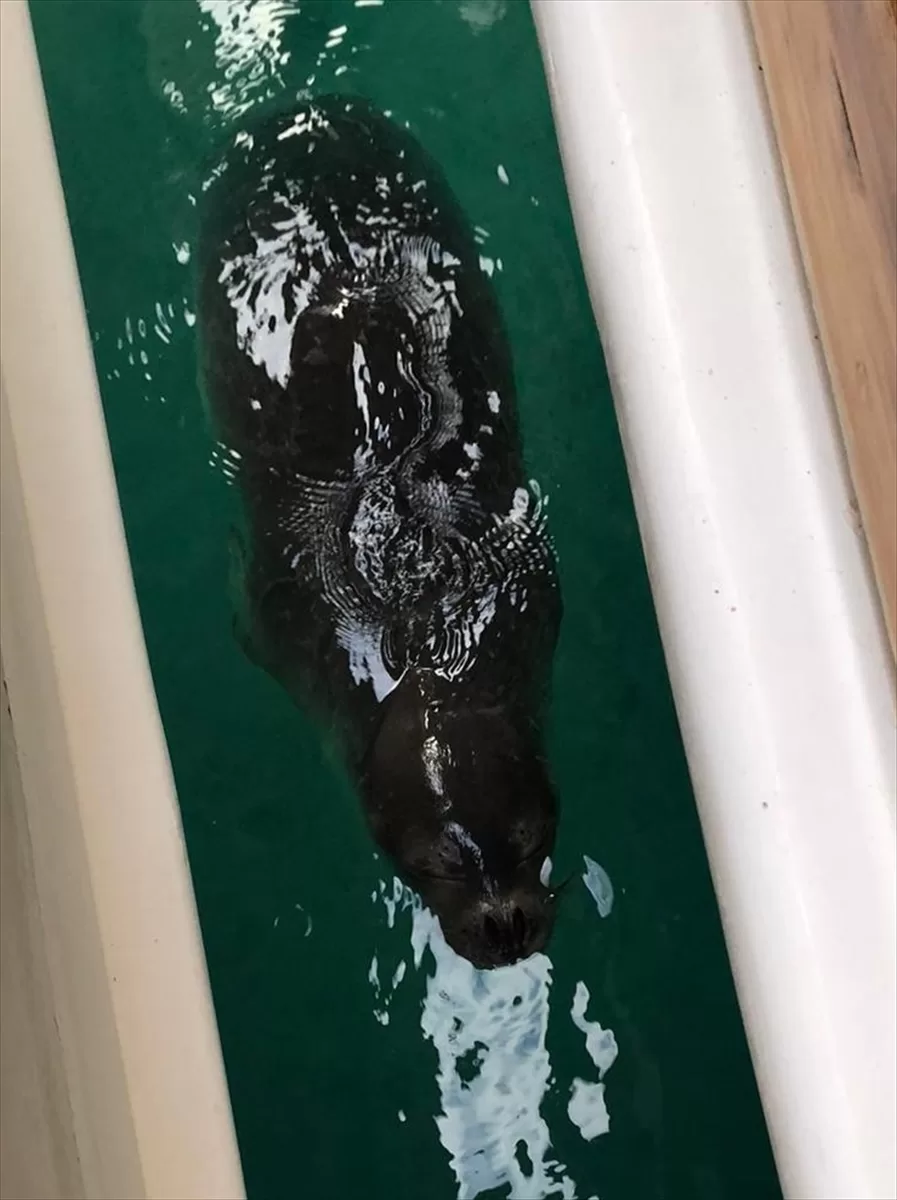 Yat limanında bulunan balıkçılar, teknelerin arasında yüzen fok olduğunu fark etti.