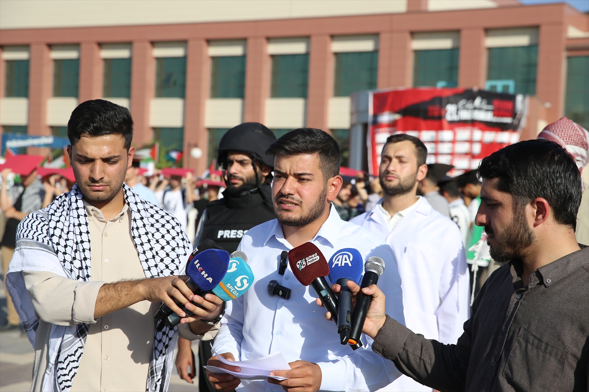 Dicle Üniversitesi Hukuk Fakültesi 3. sınıf öğrencisi Ali Sav, öğrenciler adına yaptığı açıklamada, Filistin'in özgürlüğü, adalet ve insanlık için toplandıklarını söyledi.