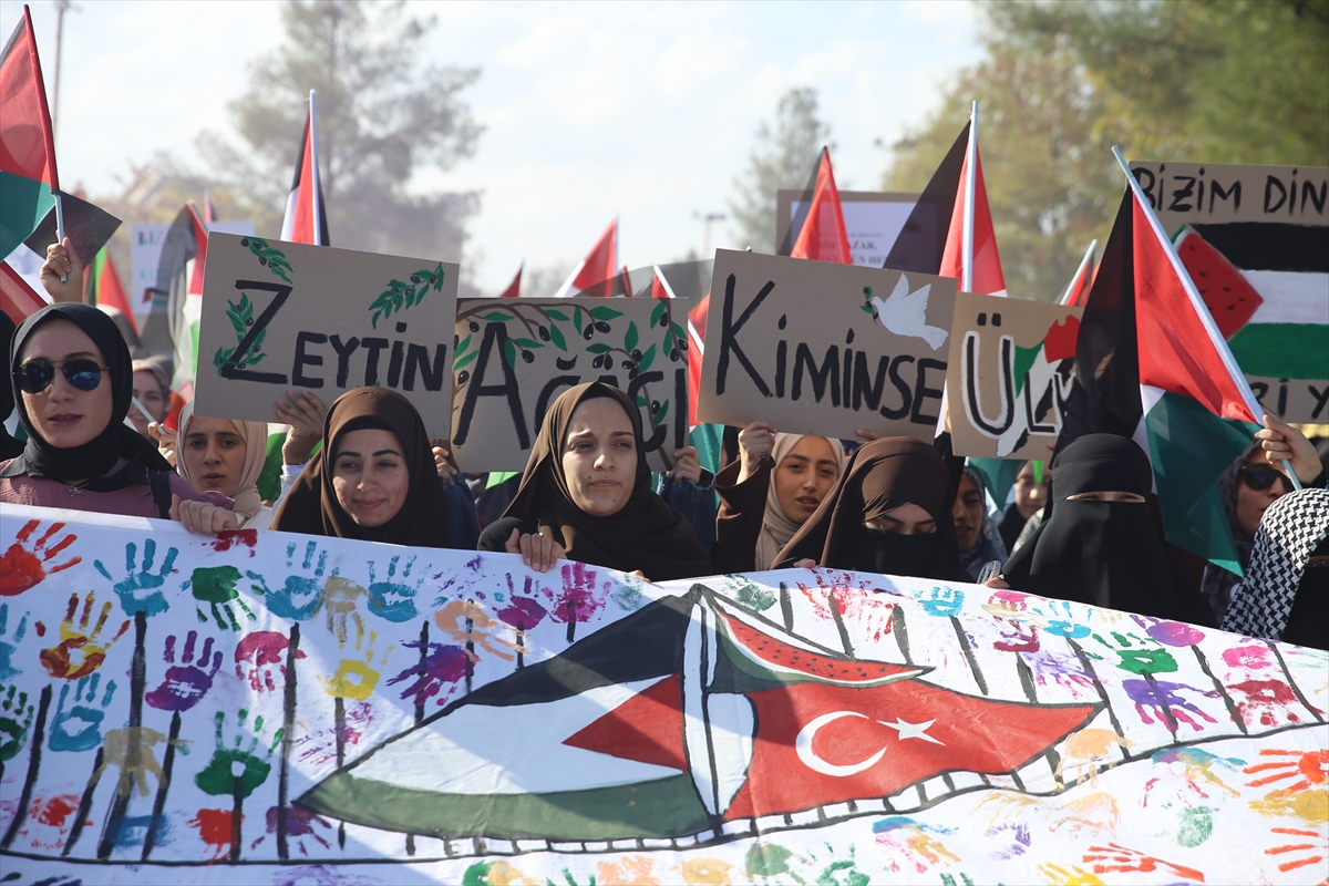 Diyarbakır'da Dicle Üniversitesi Öğrenci Toplulukları öncülüğünde Öğrenci İşleri Merkezi önünde toplanan öğrenciler, "Çocuklar ölürken sessiz kalınmaz", "Mescid-i Aksa Onurumuzdur" sloganları eşliğinde "Nehirden Denize Özgür Filistin" afişiyle Kongre Merkezi önüne kadar yürüdü.