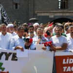 Namazın ardından bazı sivil toplum kuruluşları öncülüğünde cami önünde bir araya gelen kalabalık, İsrail aleyhine slogan attı.