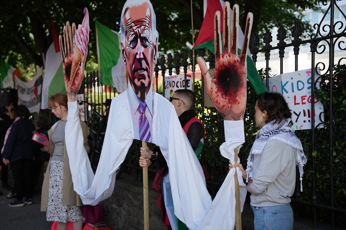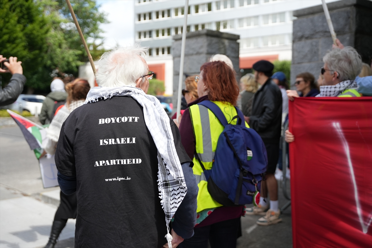 Otelin önünde, İrlanda Filistin Dayanışma Derneği tarafından düzenlenen gösteride, "ABD'nin İsrail’in Gazze'de gerçekleştirdiği soykırımdaki ortaklığını" bitirmesi talep edildi.