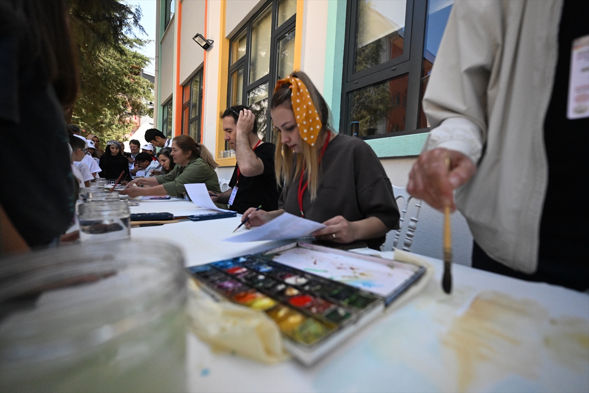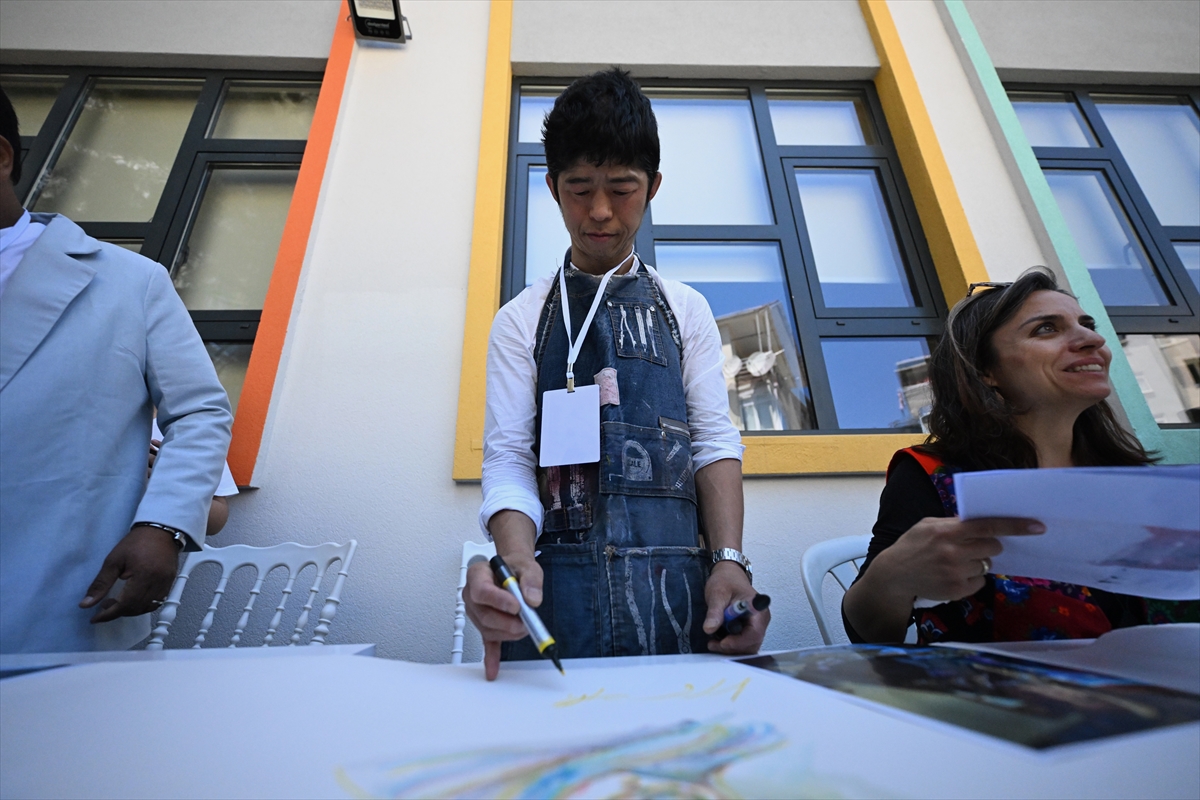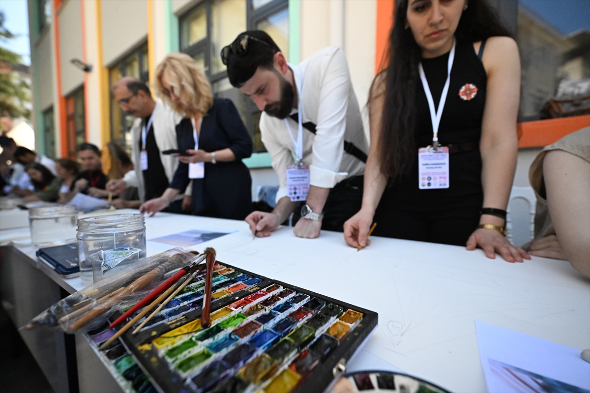 Ülkelerinin halk oyunları gösterimini de yapan sanatçılar, daha sonra merkezin bahçesinde kurulan alanda özel hazırlanan 70 metrelik tual üzerine özgün suluboya çalışmalarını yaptı.