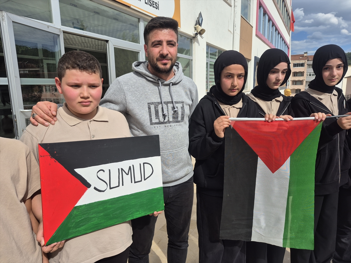 Okul bahçesinde bir araya gelen öğrenciler, "Gazze" yazısı oluşturarak Filistin ve Türk bayraklarını dalgalandırdı.
