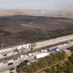 Yangının olduğu bölgede 8 otomobil, 3 tır ve 1 kamyonun karıştığı zincirleme trafik kazası meydana geldi.