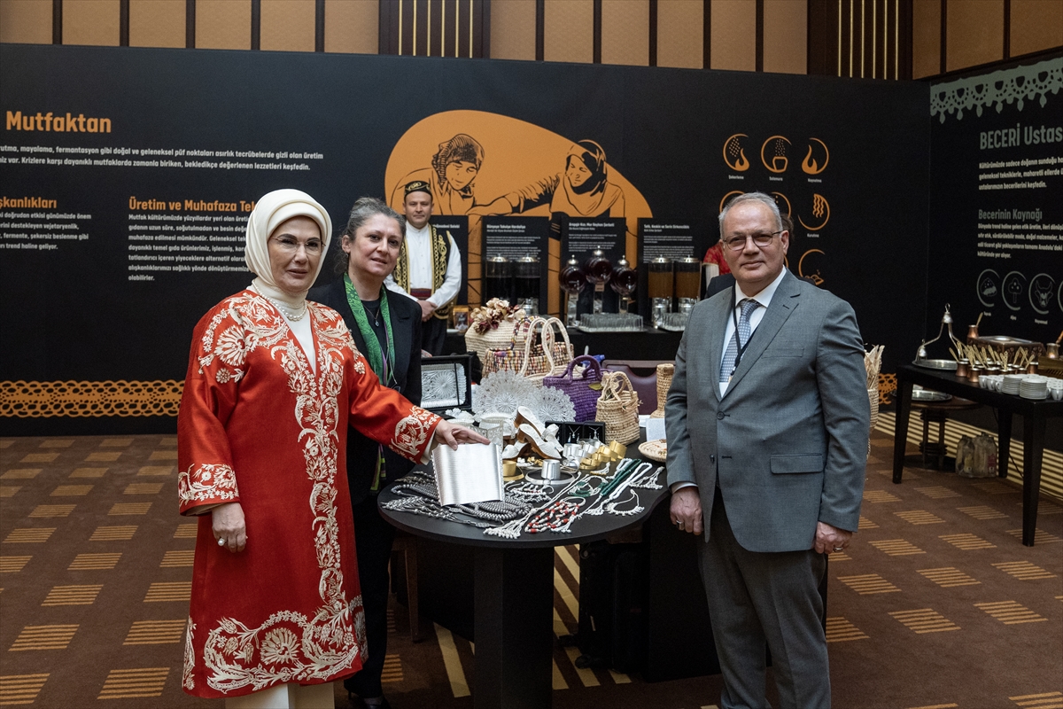 Emine Erdoğan, sergide yer alan Anadolu'nun kültürel mirası olan ürünler hakkında Kalkınma Ajansı Başkanı Ahmet Şimşek'ten ve Bakan Kacır'dan bilgi aldı.