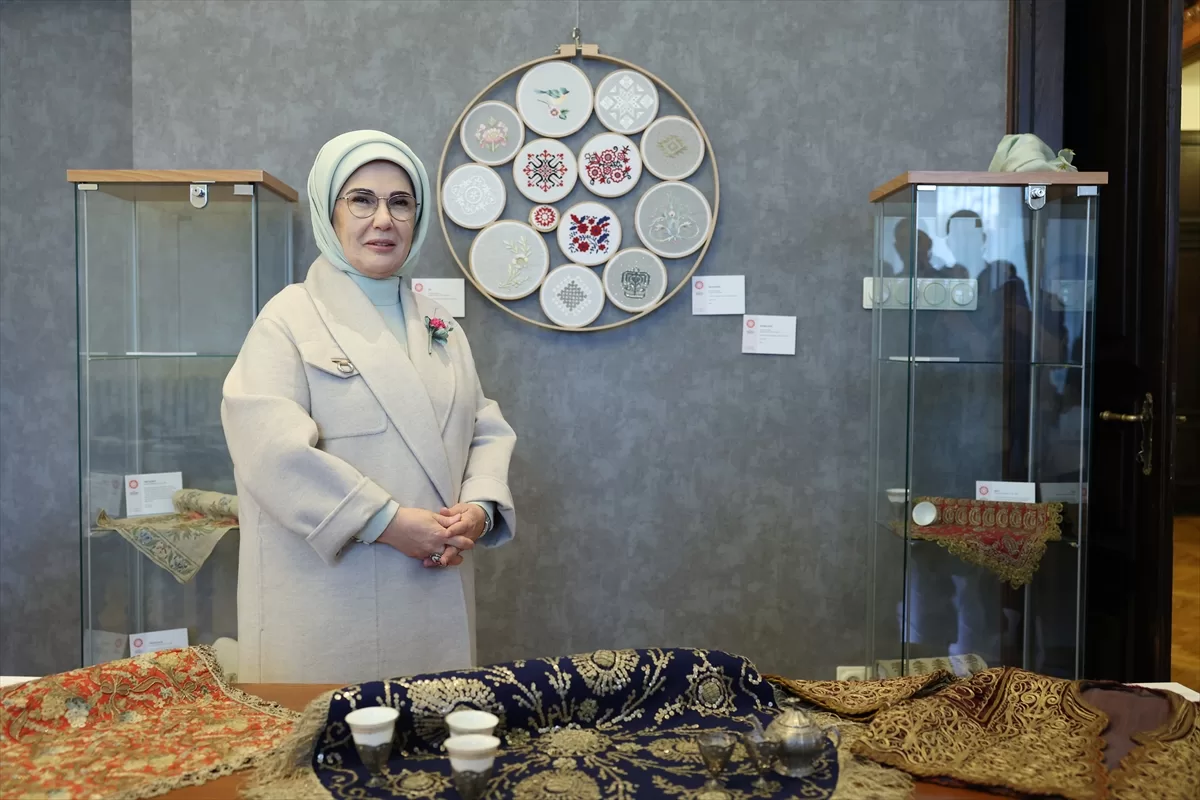 "Motiflerin Dili" projesi kapsamında İstanbul Beylerbeyi Sabancı Olgunlaşma Enstitüsü atölyelerinde hazırlanan koleksiyonlardan seçilen eserlerin, "Klasik Sanat Motifleri" ve "Anadolu Halk Motifleri" başlıklarıyla sunulduğu sergiyi gezen Emine Erdoğan, Türk ve Macar kültürlerine ait el sanatlarının ve motiflerin yer aldığı eserleri inceledi.