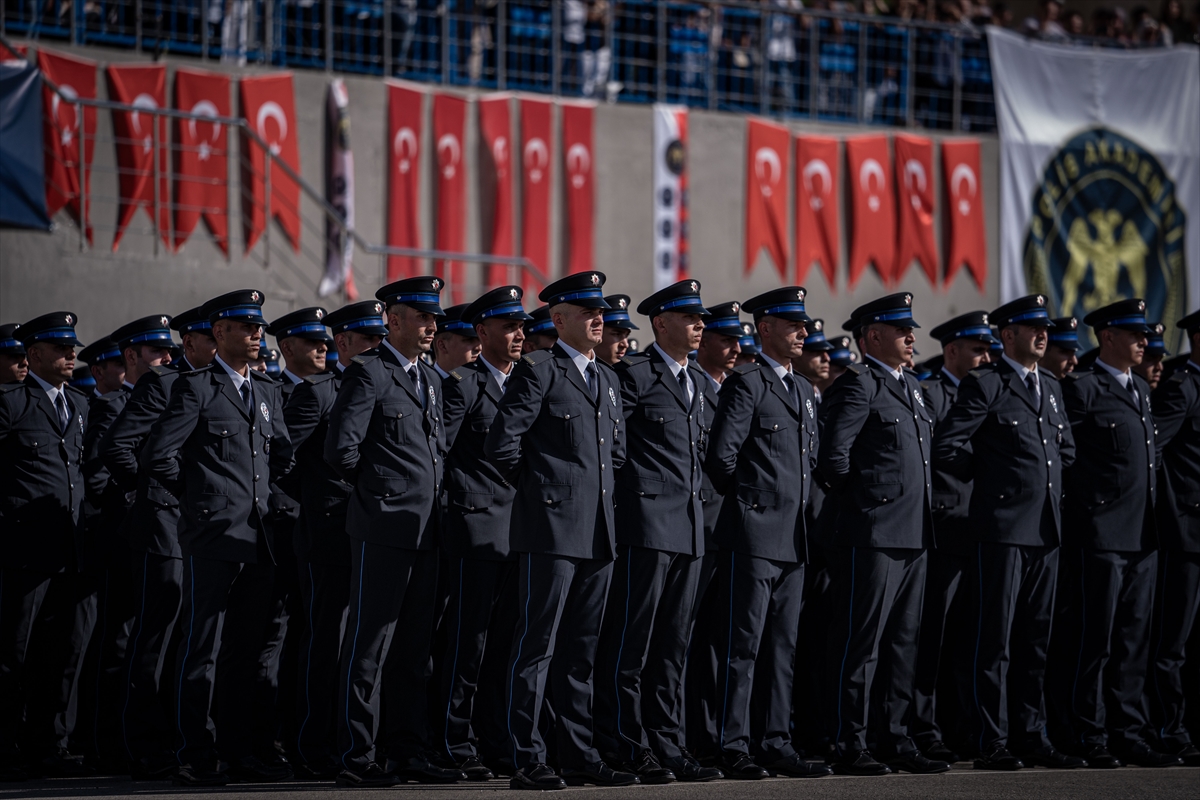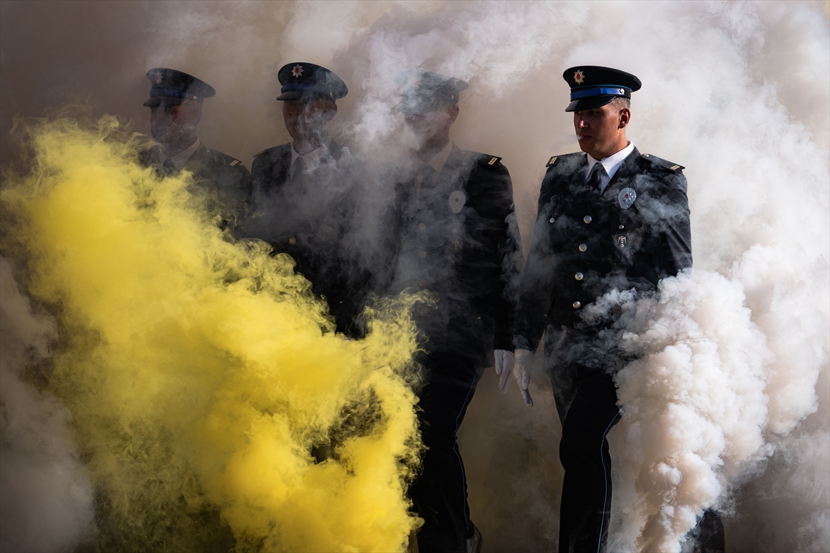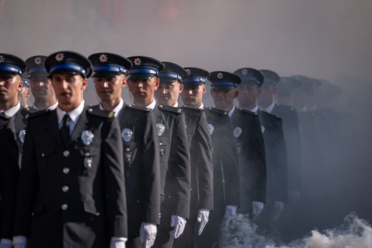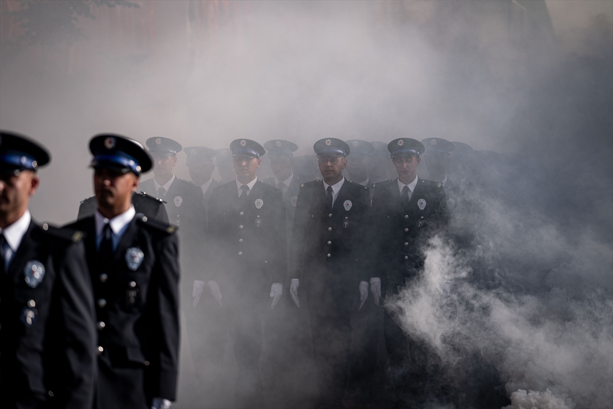Polis adayları yemin ettikten sonra renkli sisler arasında bayrak yürüyüşü yapıp kep attı, arkadaşları ve aileleriyle kucaklaşarak sevinçlerini paylaştı.