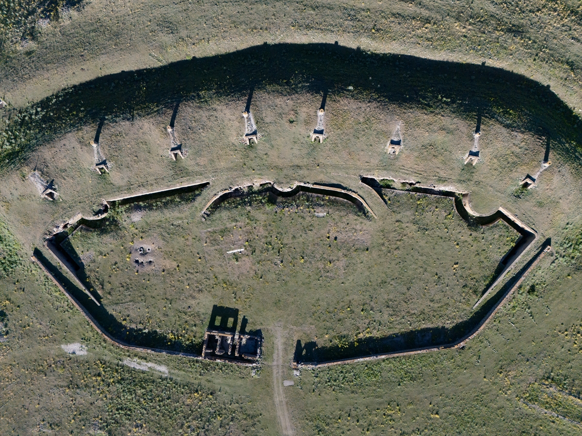 Topçu odalarına avlunun ortasındaki iki rampa ile çıkılan tabya havadan görüntülendi.