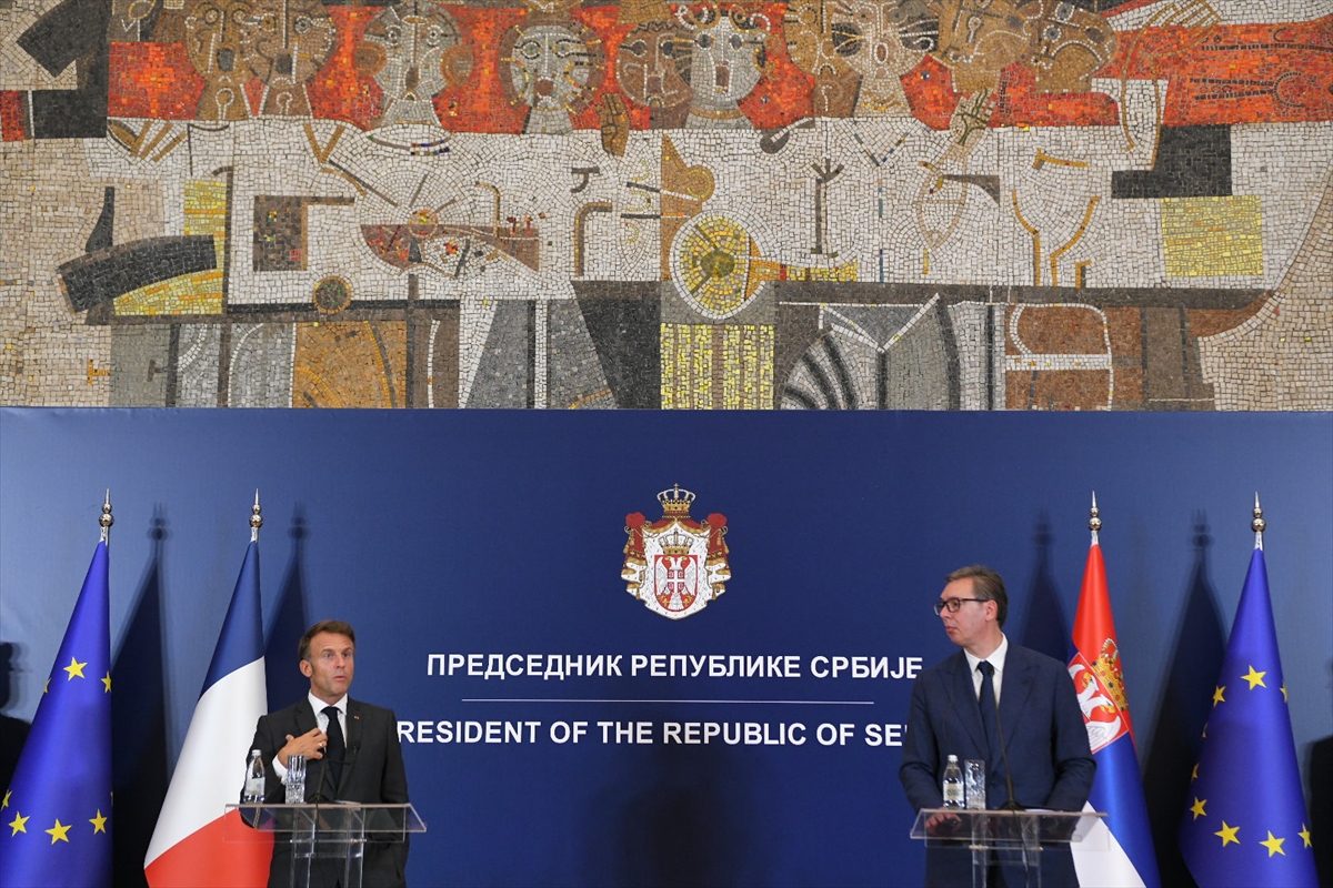 Resmi ziyaret için Sırbistan'ın başkenti Belgrad'da bulunan Macron, Sırbistan Sarayı'ndaki karşılama töreninin ardından Sırp mevkidaşı Aleksandar Vucic ile görüştü ve ortak basın toplantısı düzenledi.