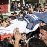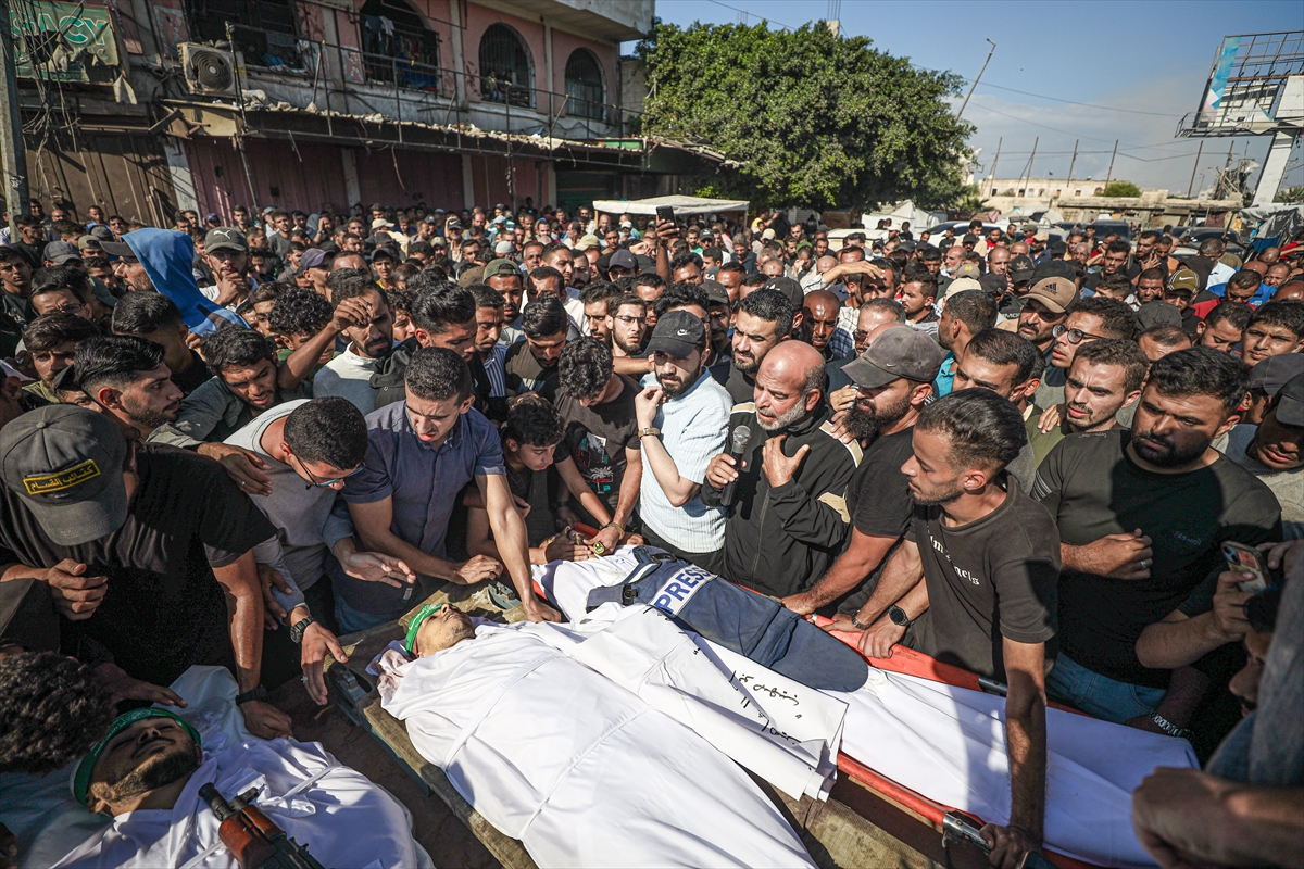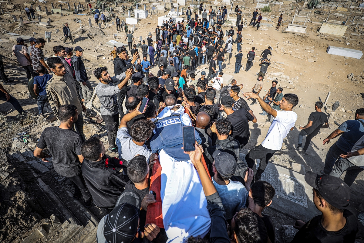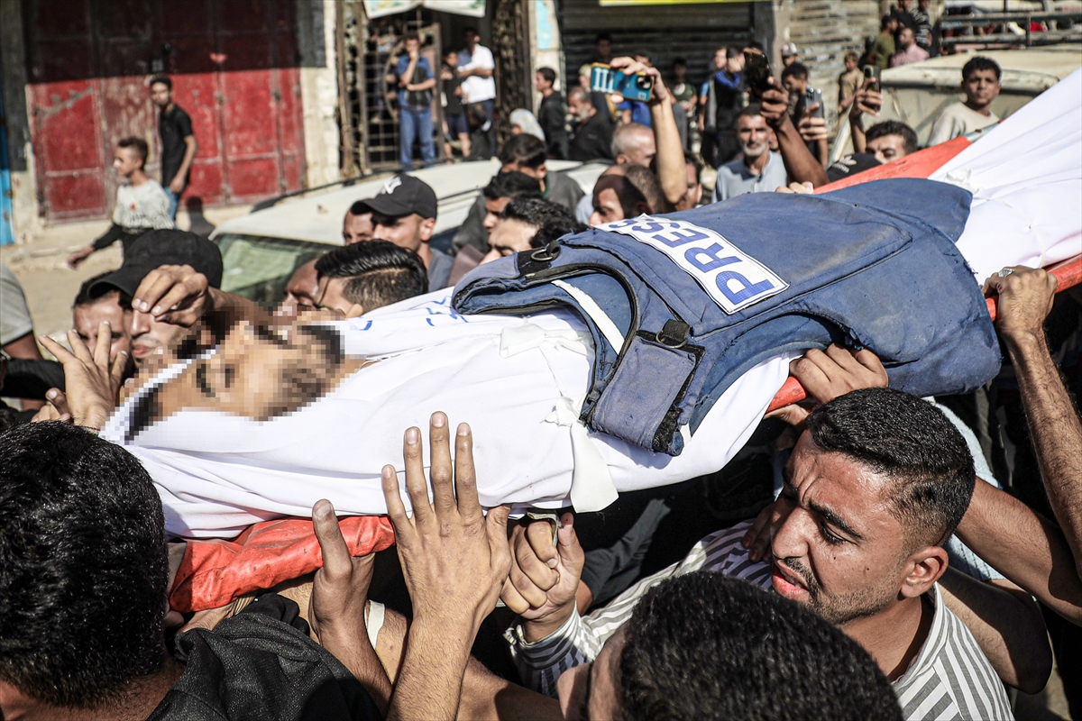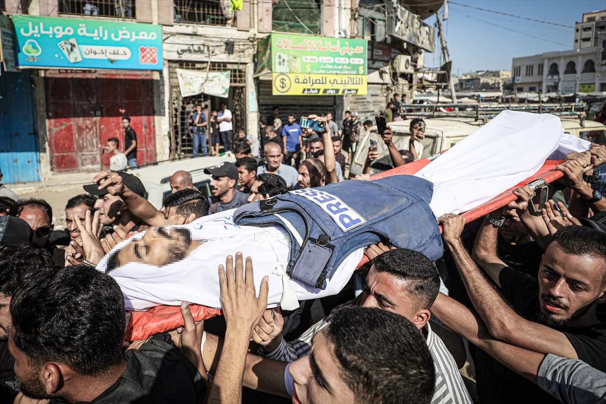 Filistinli gazeteci Caferavi'nin "basın" yazılı çelik yelek giyimli naaşının Gazze kentindeki El-Ehli Baptist Hastanesi'ne götürüldüğü görüntüler sosyal medyada paylaşıldı.