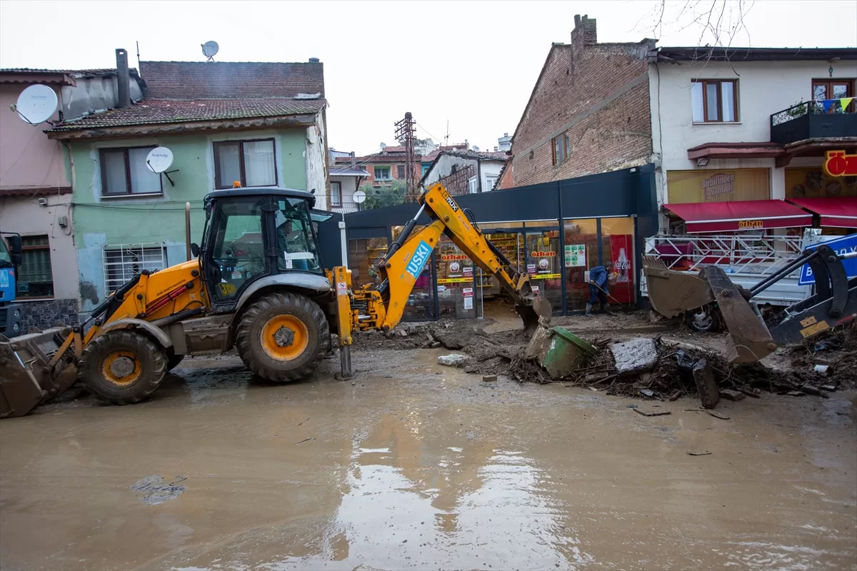 Sel sularının taşıdığı çamurlarla kaplanan yollar iş makineleriyle temizlenirken, ev ve iş yerlerini basan sular da BUSKİ ekipleri tarafından tahliye ediliyor.