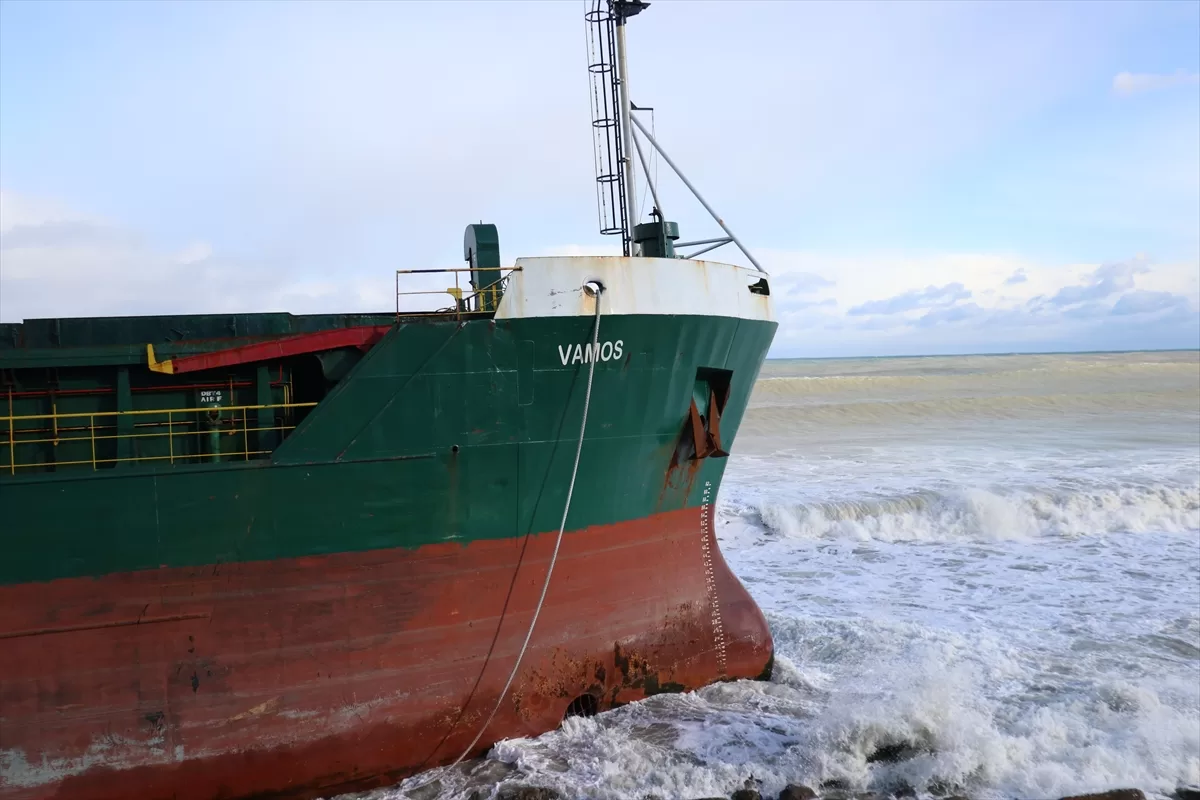 İnebolu ilçesinde fırtına nedeniyle Kamerun bayraklı "Vamos" adlı kuru yük gemisi kıyıya sürüklendi.