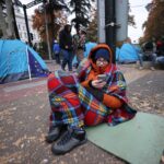 Tiflis'in en yoğun caddelerinden birini kapatan göstericiler, soğuk hava nedeniyle gece boyunca ateş yakarak kampta kalmaya devam etti.