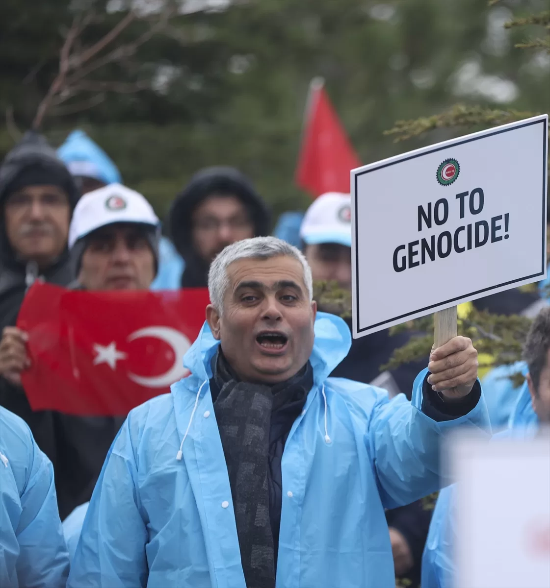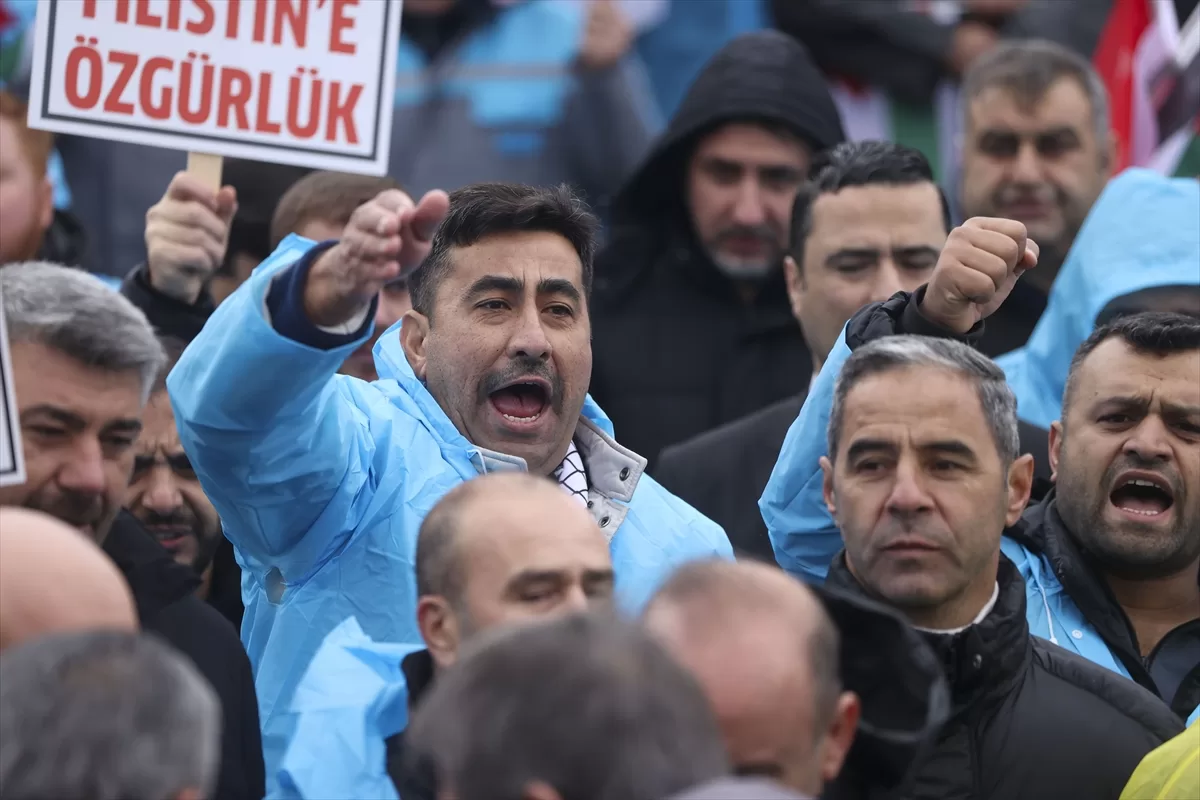 Pankart ve dövizler taşıyan üyeler bir süre İsrail aleyhinde slogan attı.