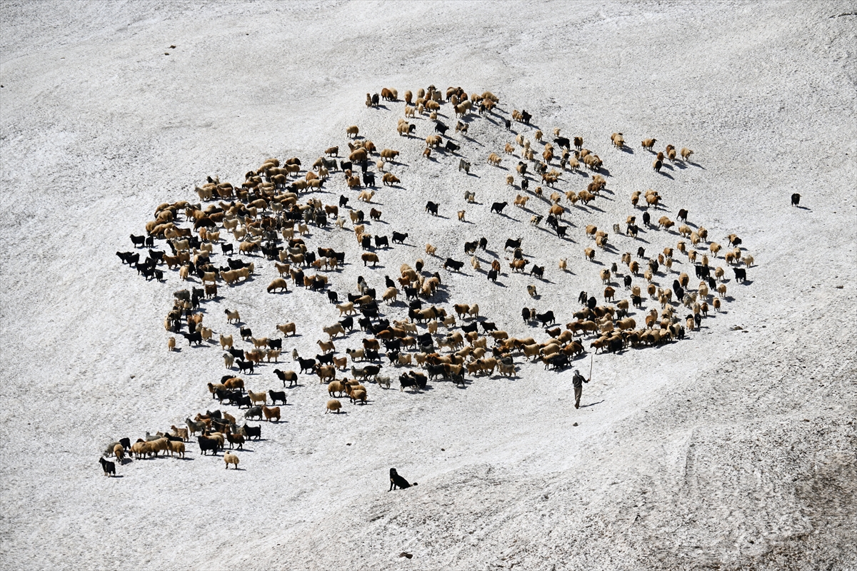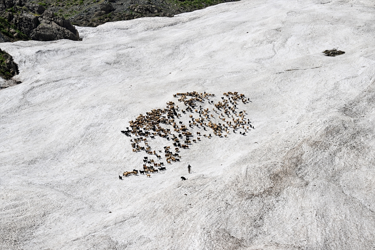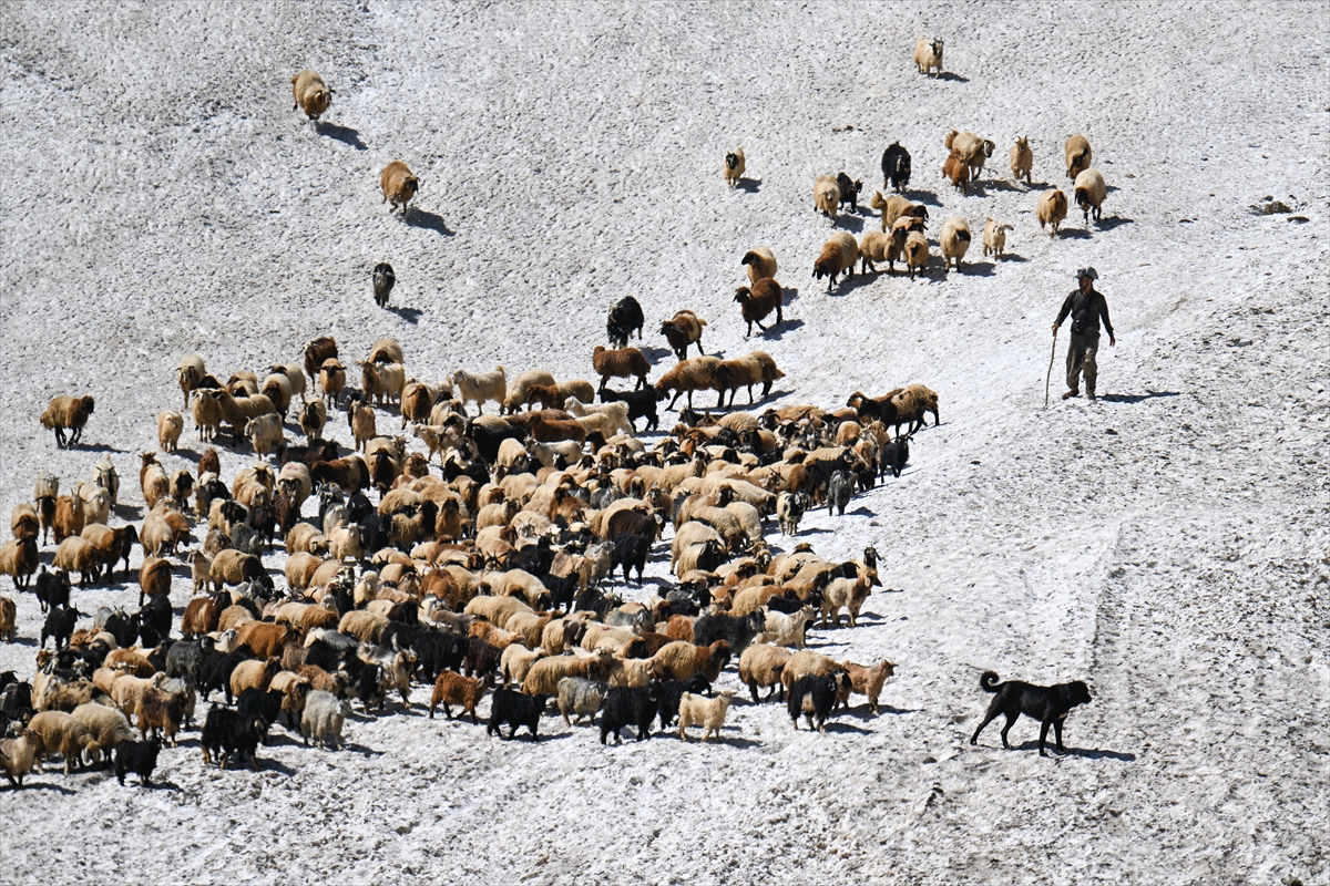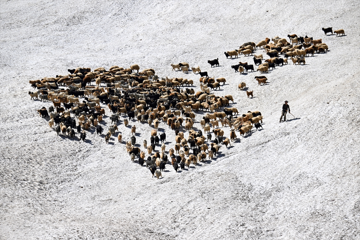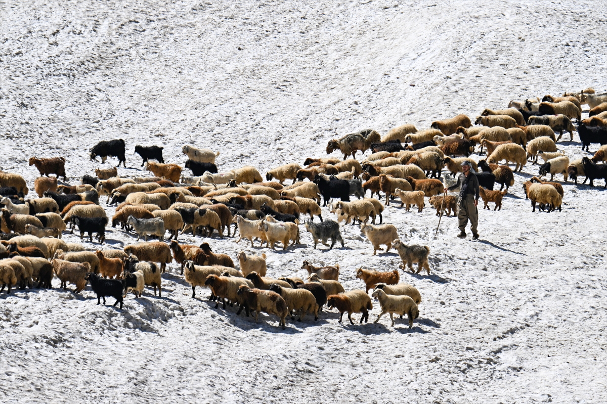 Havanın ısınmasıyla hayvanlarını yaylalarda otlatan çobanlar da sağım için indirdikleri küçükbaş hayvanları kar örtüsünün bulunduğu alanlardan geçirmek zorunda kalıyor.