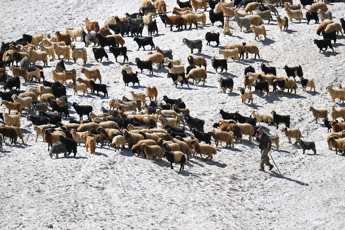 HAKKARİ (AA) – Hakkari'de çobanlar, yaylalarda otlattıkları küçükbaş hayvanlarını kar örtüsünün kalkmadığı arazileri aşarak sağımın yapılacağı alanlara götürüyor.