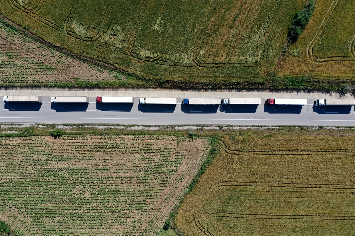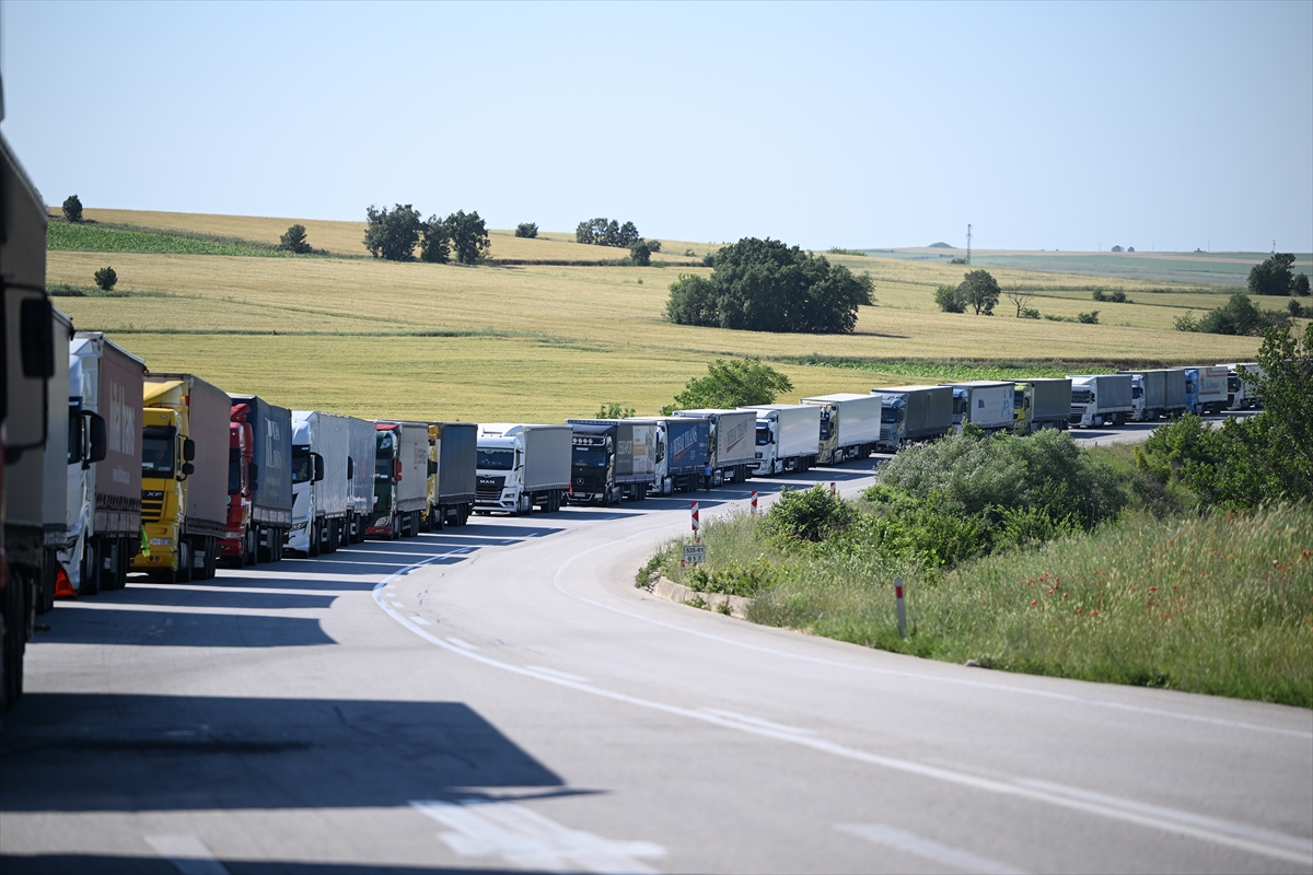 EDİRNE (AA) – Hamzabeyli Sınır Kapısı'ndan yurt dışına çıkmak için bekleyen tırlar, yaklaşık 26 kilometrelik kuyruk oluşturdu.