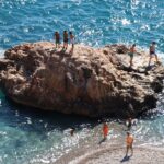 Çocuklar, Varyant bölgesinden kayalıklardan denize atlayarak, Akdeniz'in mavi sularında kulaç attı. Bazı turistler, su sporları istasyonlarından jet ski, yelkenli ve deniz paraşütü yaptı. Varyant Seyir Terası'nda da yoğunluk gözlendi.
