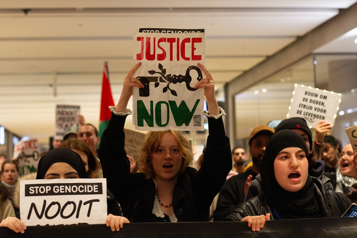 Merkez niteliğindeki Utrecht’te tren istasyonunda toplanan göstericiler, Filistin bayrakları taşıyarak İsrail’in soykırımı durdurması için eylem yaptı.