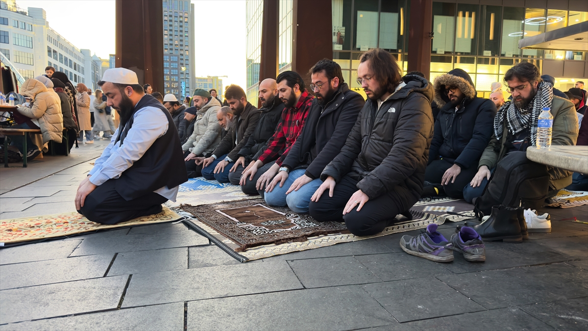 Katılımcılar, meydanda sokağa serdikleri halı üzerinde akşam namazını kıldı.