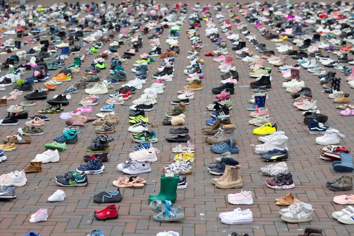 Gazze'de her 10 dakikada bir çocuğun öldürülmesine dikkati çekmek için meydana her 10 dakikada bir çift ayakkabı konuldu.