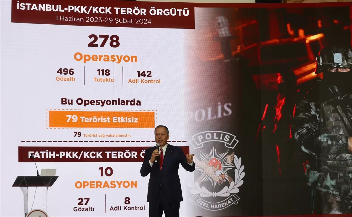 9 aylık görev süresi boyunca suç örgütlerine göz açtırmadıklarını dile getiren Yerlikaya, "İstanbul'da 1 Haziran 2023 – 29 Şubat 2024 tarihleri arasında genelinde PKK terör örgütüne yönelik 278 operasyon yapıldı. Bu operasyonlarda 79 terörist sağ olarak yakalanırken, 496 kişi gözaltına alındı. Bunlardan da 118'i tutuklandı, 142'si adli kontrol şartıyla serbest bırakıldı." ifadelerini kullandı.