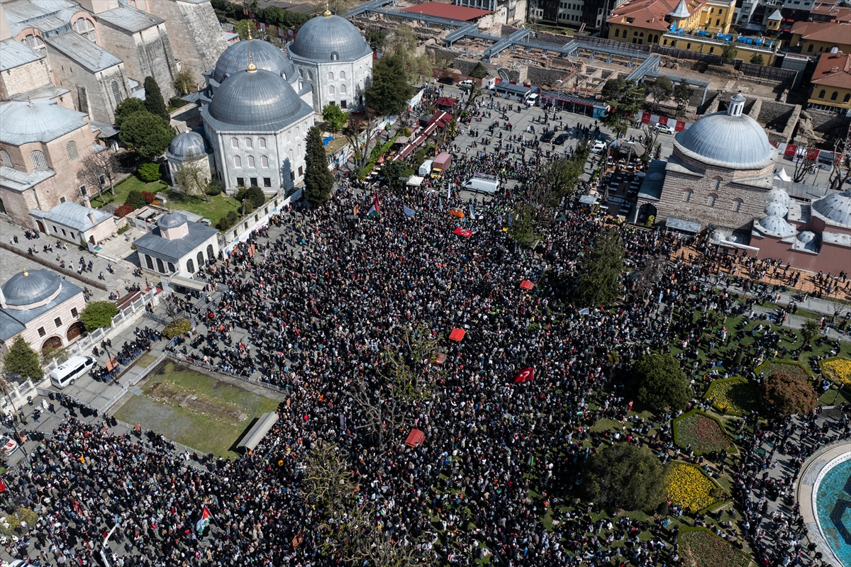 Katılımcıların Ayasofya-i Kebir Camii Şerifi'ne kadar yürüdüğü etkinlikte meydana kurulan platformdan İsrail'in saldırılarını protesto için çeşitli konuşmaların yapılması bekleniyor.
