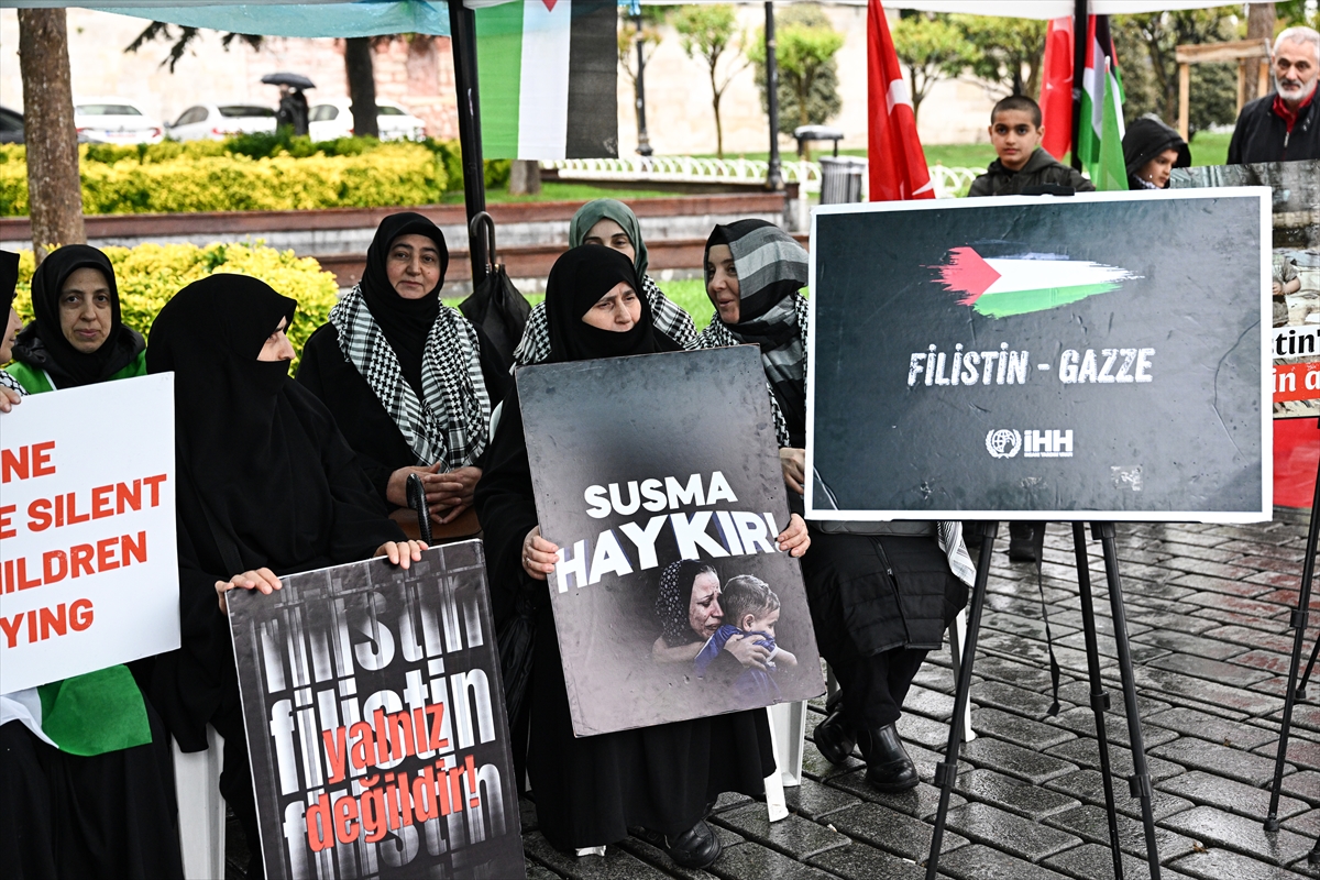 Alman Çeşmesi yakınında kurulan çadırda bir araya gelen İHH üyeleri, İsrail'in Filistin'e yönelik saldırılarını protesto ediyor. Yağmurlu ve soğuk havadaki eyleme, yerli ve bazı yabancı turistler de destek veriyor.