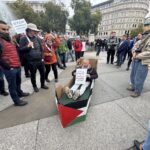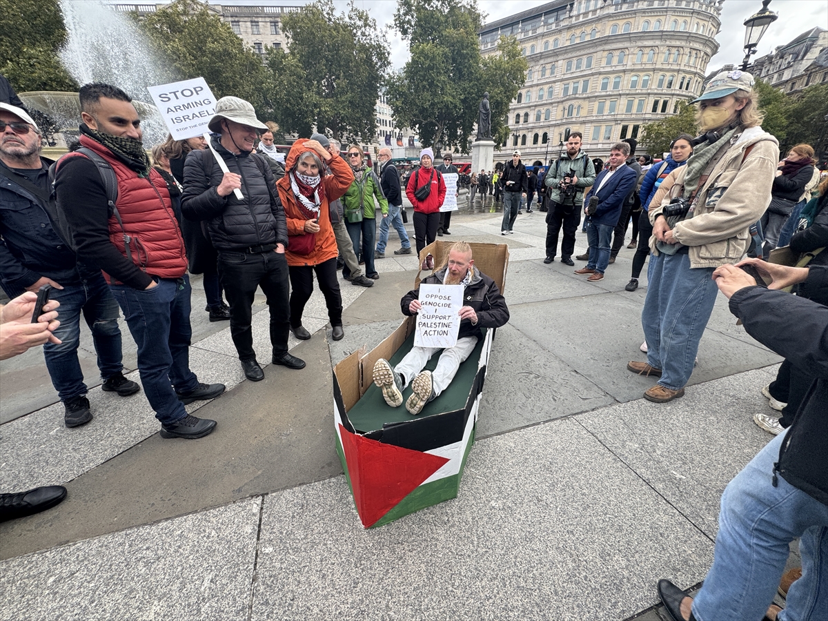 İngiltere'nin başkenti Londra'da Trafalgar Meydanı'nda gerçekleştirilen eylemde katılımcılar, "Soykırıma karşıyım, Palestine Action'ı destekliyorum" yazılı pankartlar taşıdı.