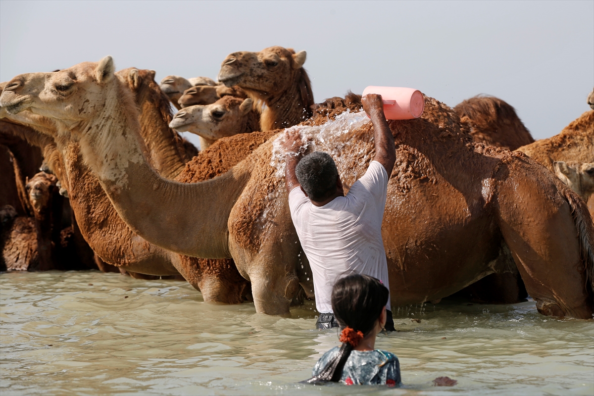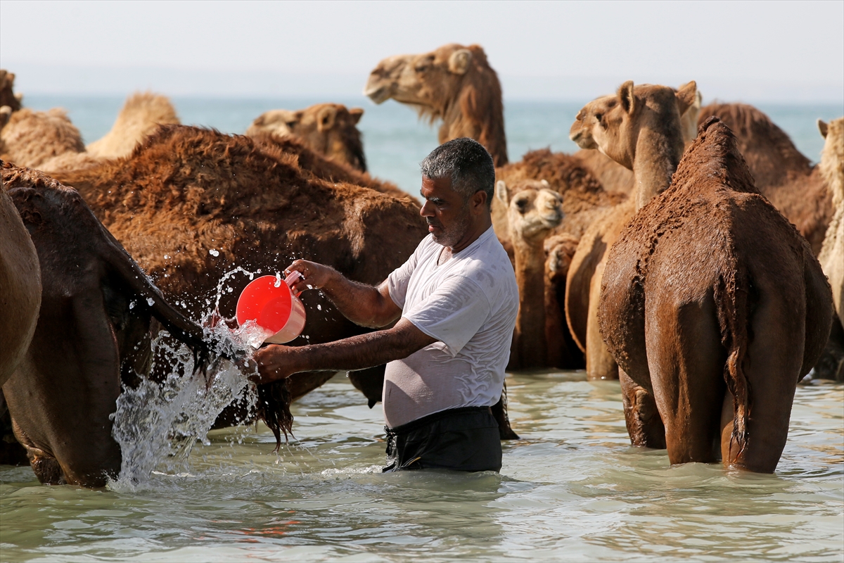 Yerel halkın önemli geçim kaynaklarından sayılan develer, sıcak havalarda hem vücut ısılarını dengelemek hem de deniz suyunun şifalı etkisinden faydalanmaları için denizde çobanlar tarafından yıkanıyor. Deniz suyunun tuzlu yapısı, develerin derisindeki parazitlerden arınmasını sağlarken aynı zamanda yaraların da iyileşmesine yardımcı oluyor.