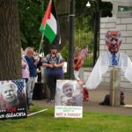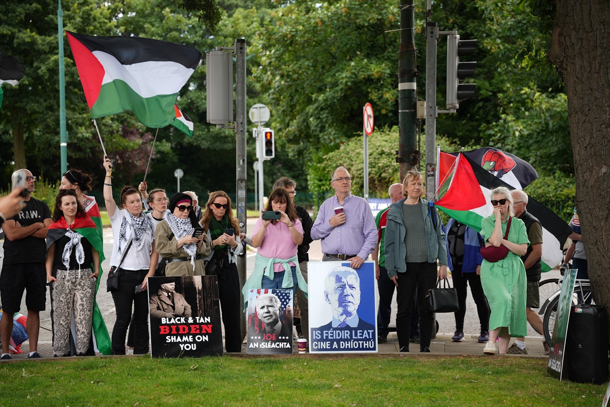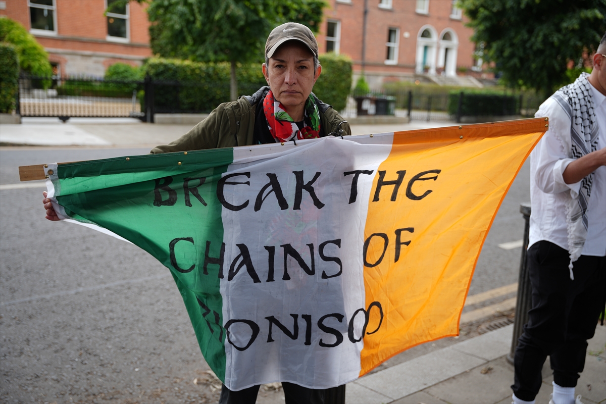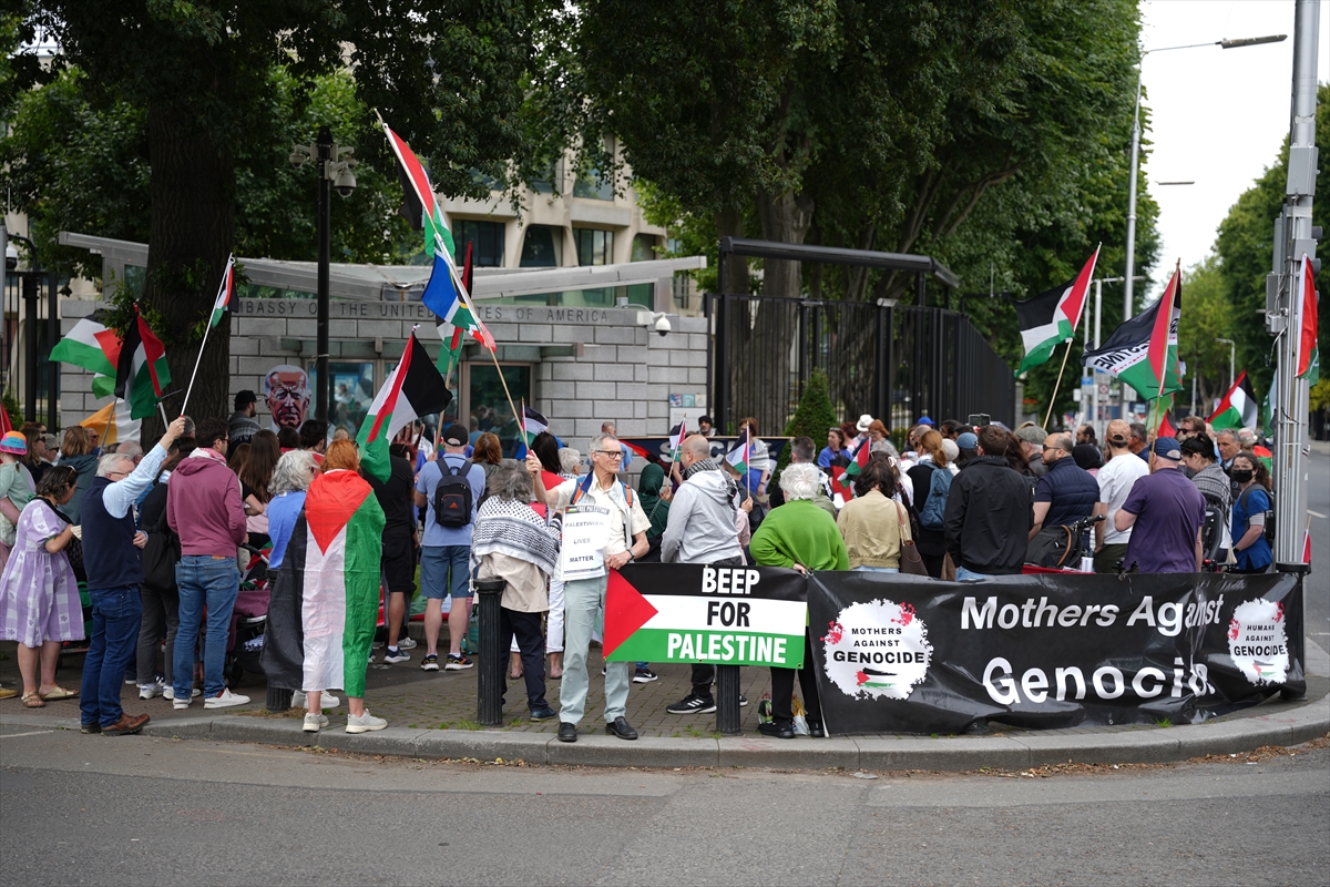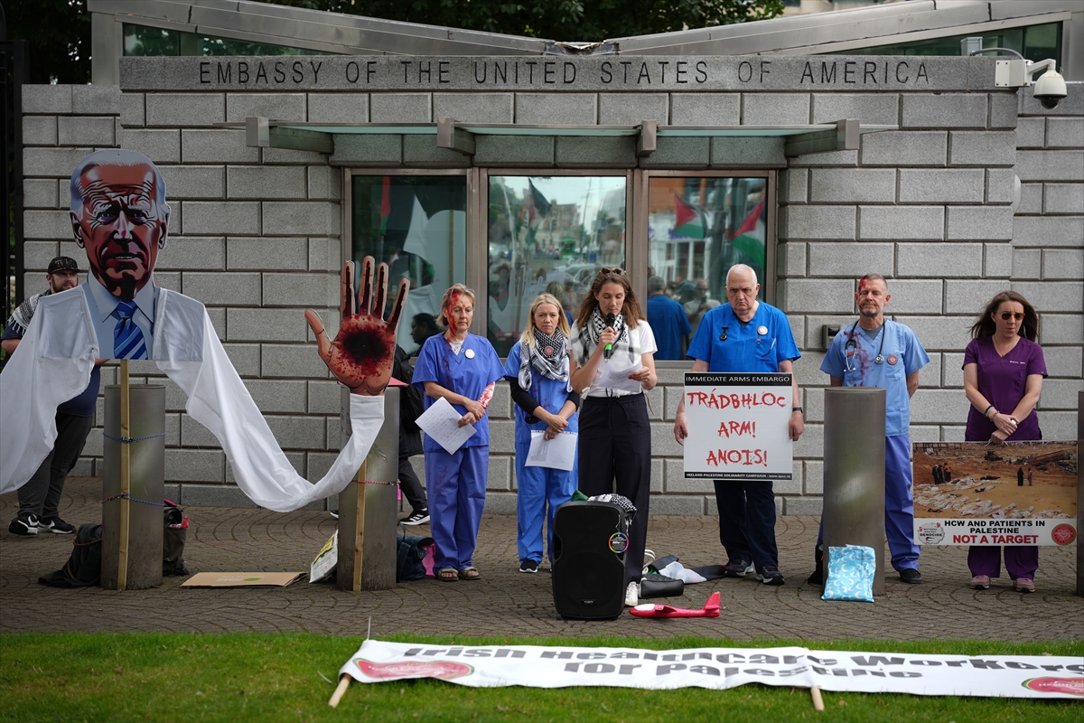 Filistin İçin İrlandalı Sağlık Çalışanları Derneği tarafından organize edilen gösteri, ABD'nin Dublin Büyükelçiliği önünde gerçekleşti.