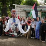 Gazze'de öldürülen sağlık çalışanlarının isimlerini okuyan göstericiler, İsrail'in Gazze’de gerçekleştirdiği soykırımda ABD'nin ortaklığına dikkat çekmek amacıyla ABD Başkanı Joe Biden posterleri açtı.