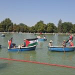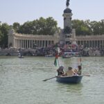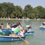 Park içindeki suni gölde kayıklarla turlayan, Filistin bayrağı sallayan ve sloganlar atan İspanyollar, İsrail'e tepkilerini evlerinden getirdikleri kaşıklarla tencere ve tavalara vurarak gösterdi.