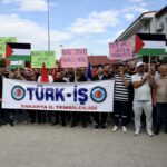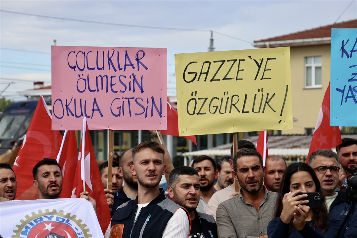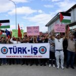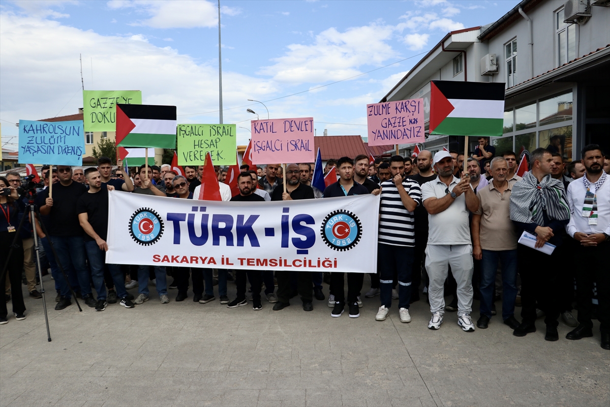 Ellerinde Türk ve Filistin bayraklarıyla Türkiye Raylı Sistem Araçları Sanayi AŞ (TÜRASAŞ) Sakarya Bölge Müdürlüğü önünde toplanan TÜRK-İŞ üyeleri, İsrail'in Küresel Sumud Filosu'na düzenlediği saldırılara tepki gösterdi.