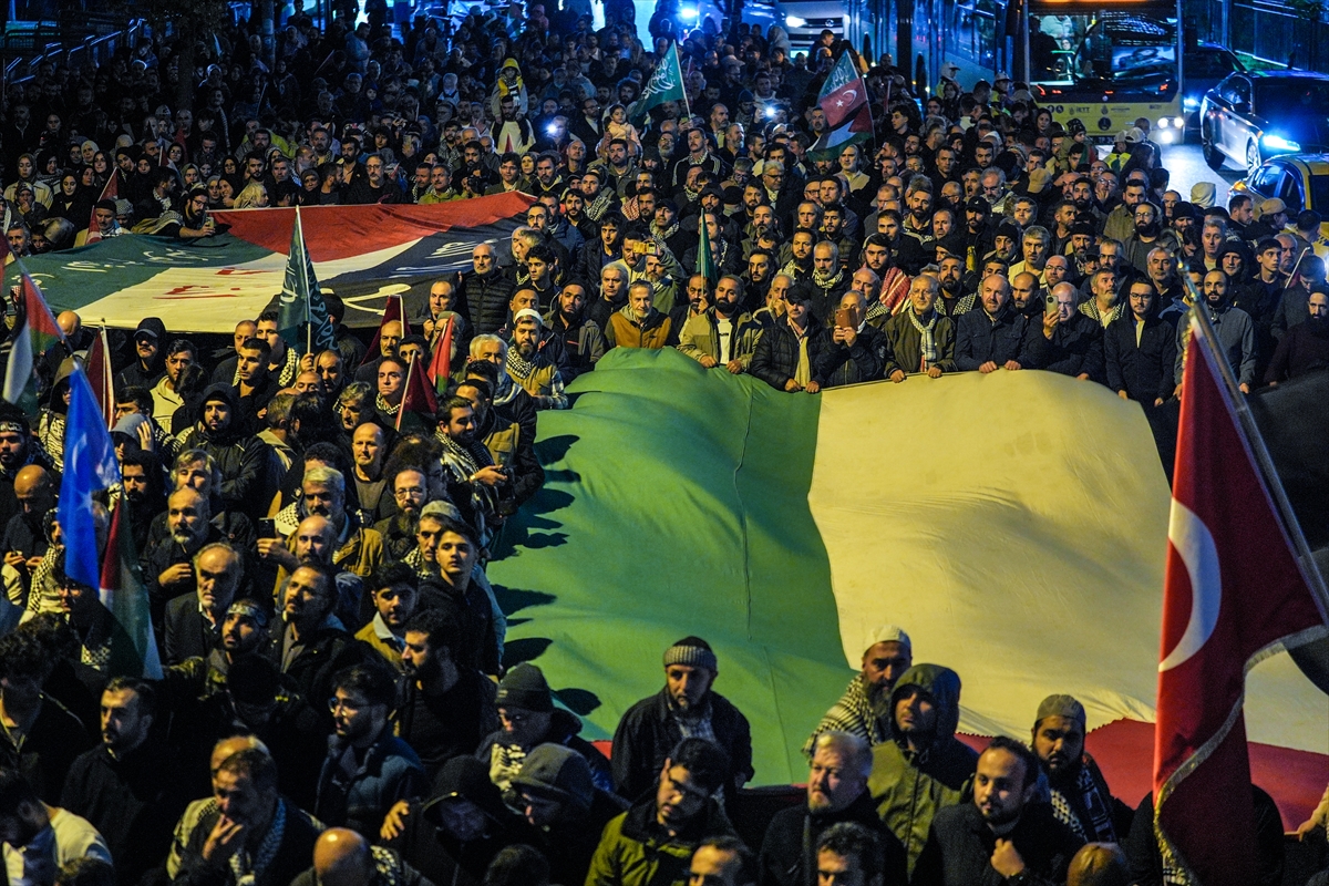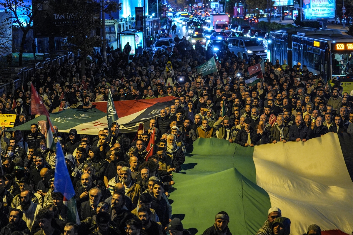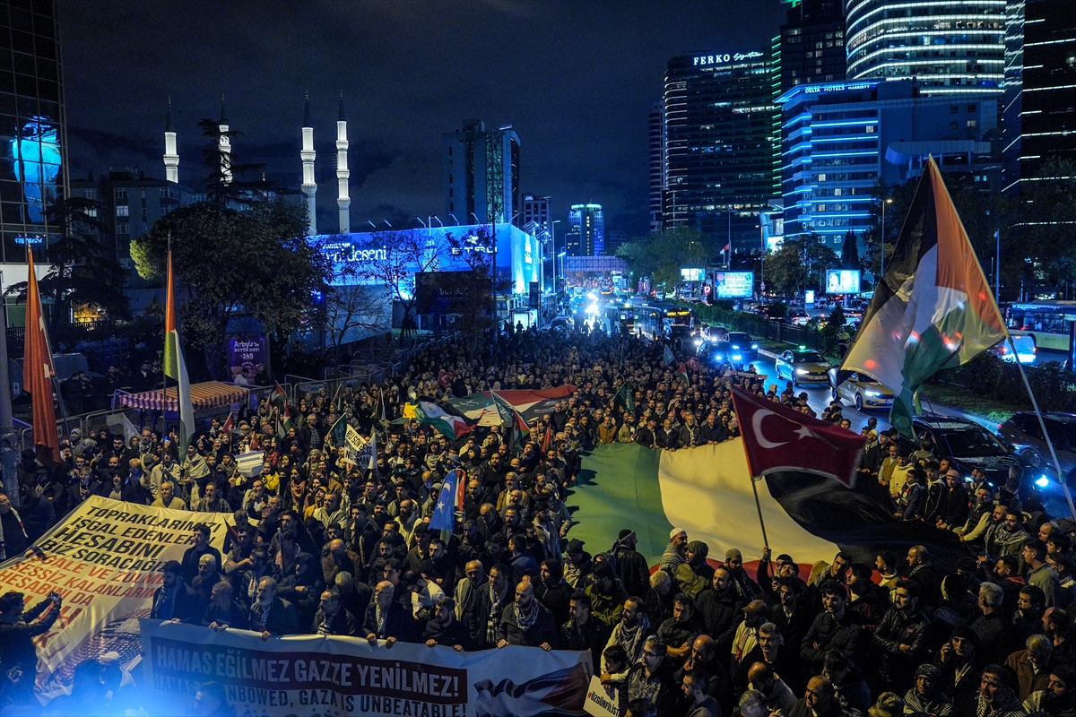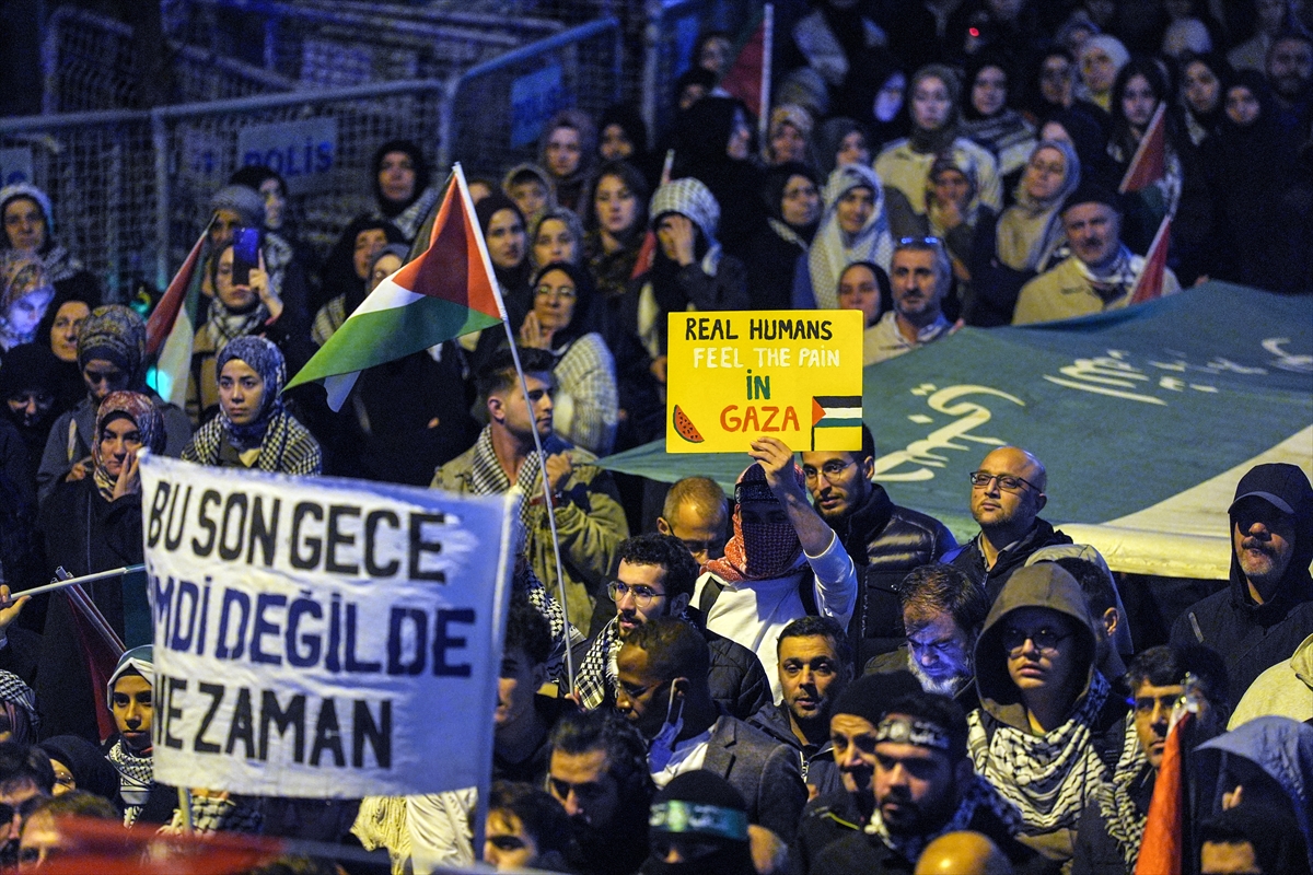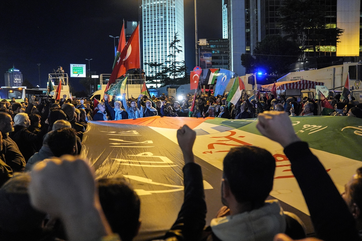 Vatandaşlar, "Özgür Filistin", "Bu son gece, şimdi değil de ne zaman?" ve "Hamas eğilmez Gazze yenilmez" yazılı pankartlar taşıyarak, "Katil İsrail hesap verecek", "Filistin halkı yalnız değildir" ve "İstanbul'dan Hamas'a, direnişe bin selam" sloganları attı.